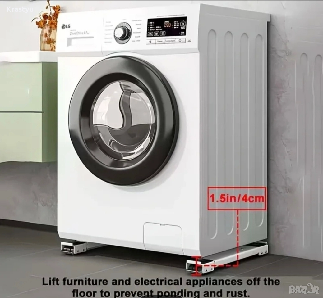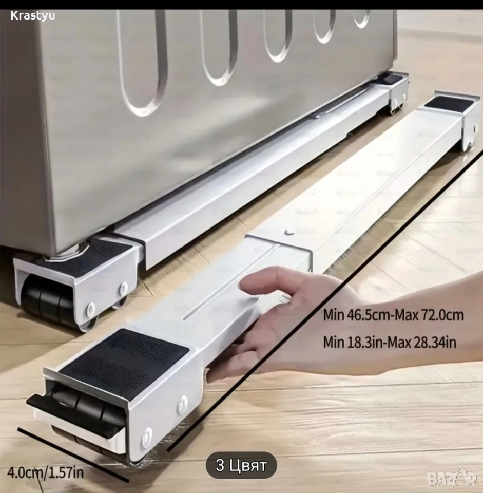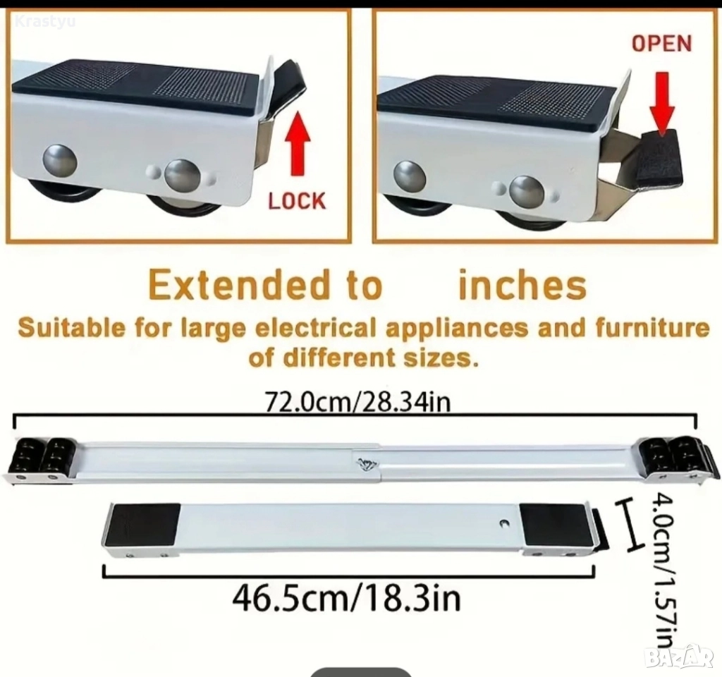 Регулируема релса за местене на уреди ,мебели и други. Лесно преместване на перални и сушилни. Механизъм за заключване на колелата .