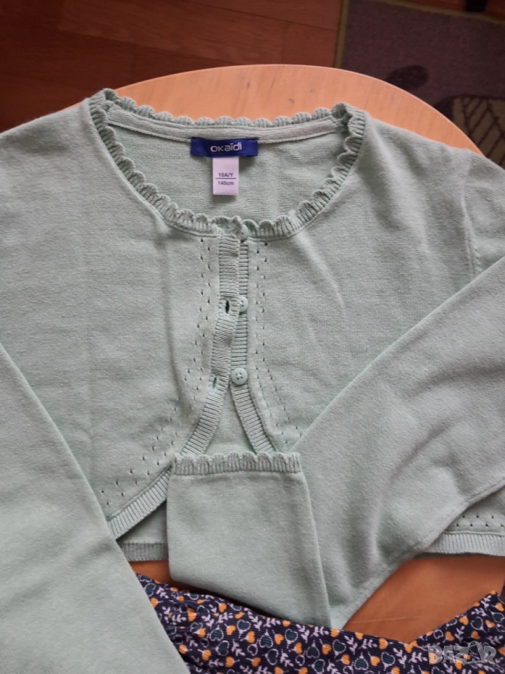 Комплект поличка и жилетка за 7-8 годишно момиченце. Носени са 2-3 пъти, тъй като номер 140 не отговаря за 10-годишно дете. Поличката е с подплата.