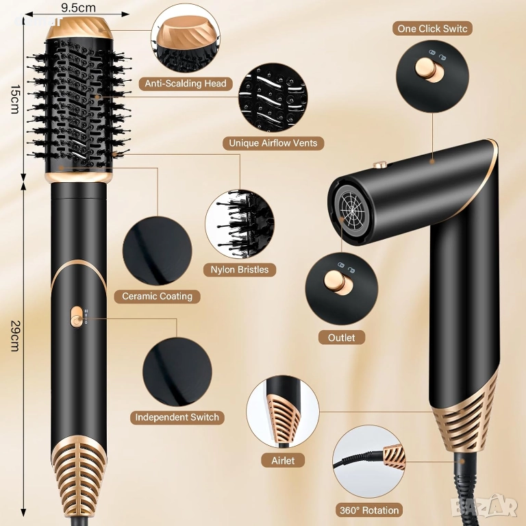 Тази 6-в-1 система за стилизиране с горещ въздух включва сменяеми глави за сушене, къдрене, изправяне, придаване на обем и разпръскване, което позволява бързо стилизиране у дома с лесна смяна на аксесоарите. Тя разполага с високоскоростен мотор за бързо сушене и три настройки за температура, подходящи за различни типове коса, като същевременно поддържа равномерен въздушен поток, за да се сведе до минимум увреждането от топлината. Две автоматични къдрици създават лесни къдрици за всички дължини на косата, а керамичното покритие с отрицателни йони намалява статичното електричество и засилва блясъка. Ергономична дръжка, гъвкави влакна, въртящ се цилиндър и въртящ се на 360° кабел осигуряват удобна употреба без заплитане, а уредът се предлага с кутия за съхранение за удобно организиране или подаряване, заедно с ясни указания за безопасност при работа и първа употреба.
