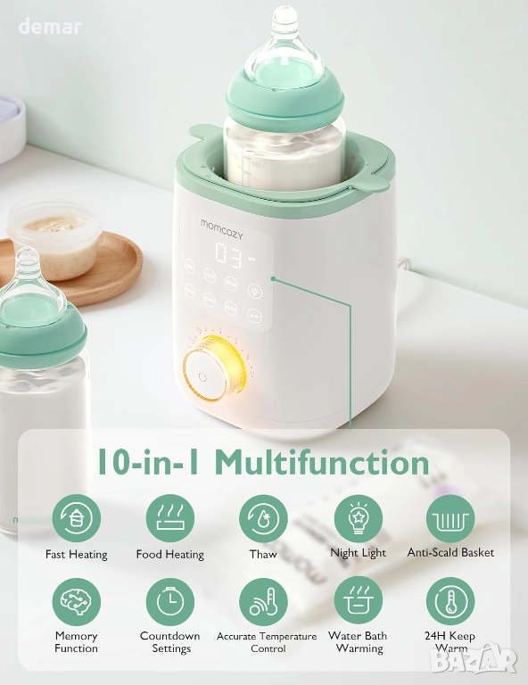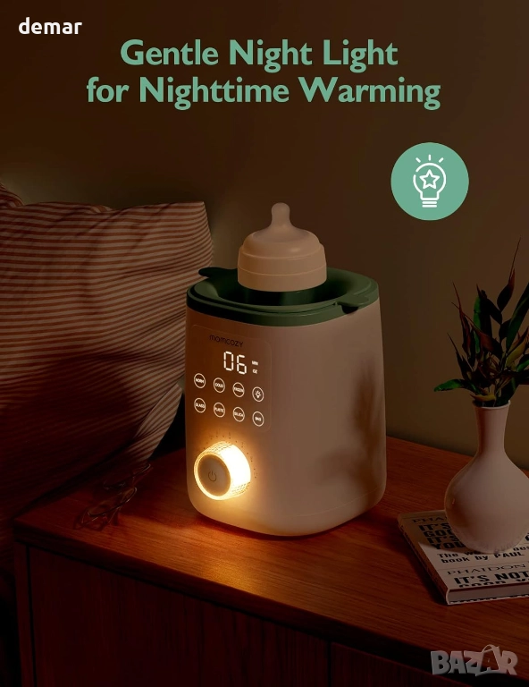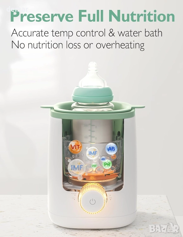 Този нагревател за шишета използва метод с нежна водна баня, за да защити хранителните вещества на кърмата, като същевременно затопля ефективно за 3–5 минути и поддържа постоянна температура до един час. Той включва обмислени удобства като мека нощна светлина, 24-часово поддържане на топлината, компактен дизайн и функция за памет, която намалява настройката до една стъпка с добавено обратно броене за по-добър контрол. Подходящ е за затопляне на мляко, както и на всички видове бебешка храна в замразена, охладена или прясна форма, поддържа над 95% от видовете шишета и торбички и е широко подходящ за подарък.