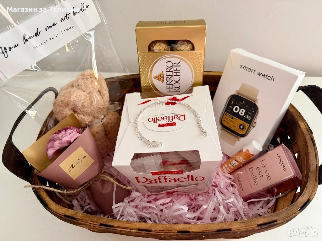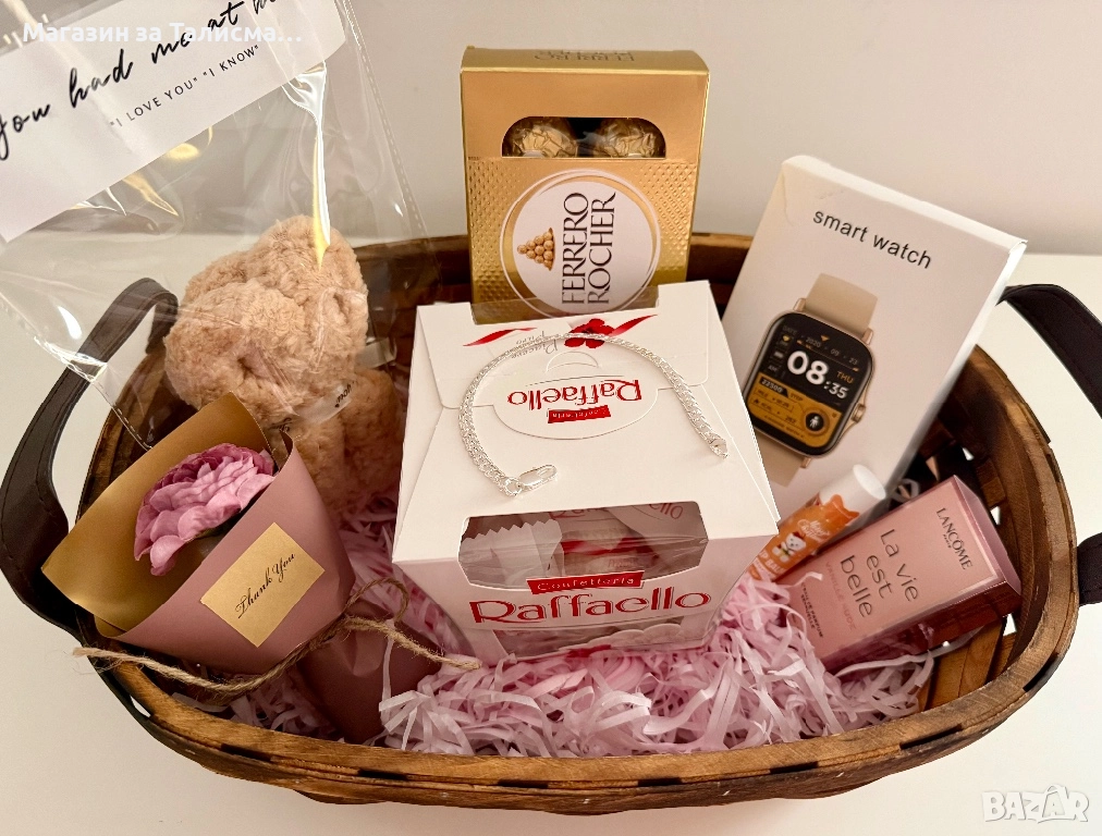 Луксозна подаръчна кошница със смарт часовник и посребрена гривна