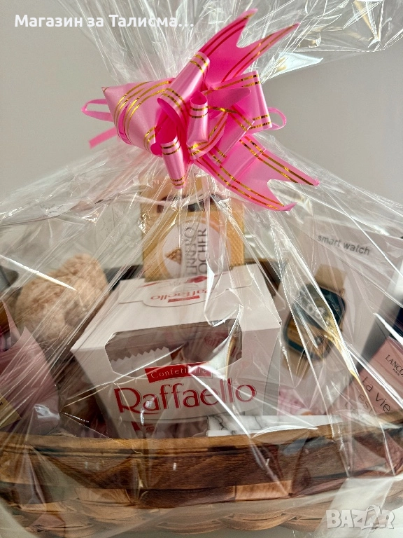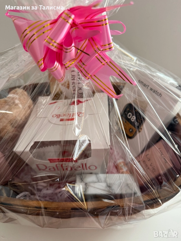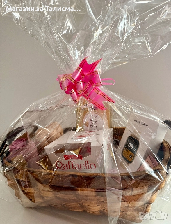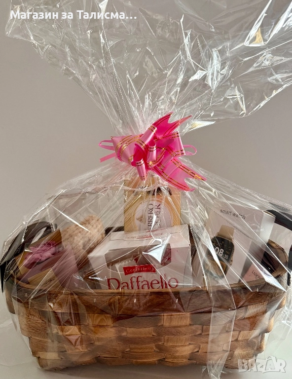 Стилна подаръчна кошница, подготвена в целуфан с панделка – готова за подаряване. Подходяща за рожден ден, имен ден, годишнина или специален повод.
