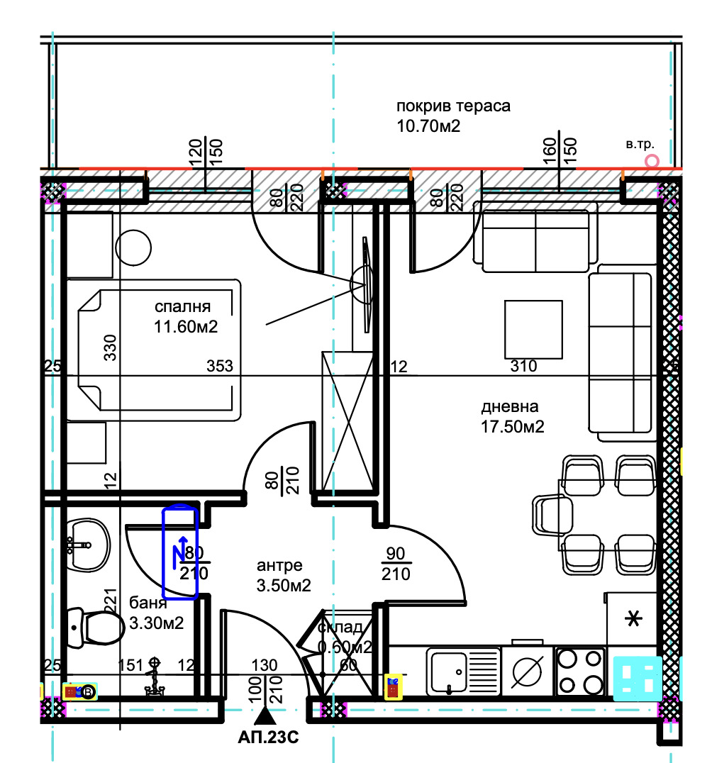 ➡Апартаментът се състои от антре, баня с тоалетна, склад, спалня, дневна с трапезария, тераса и е с обща площ от 60,7 кв.м.