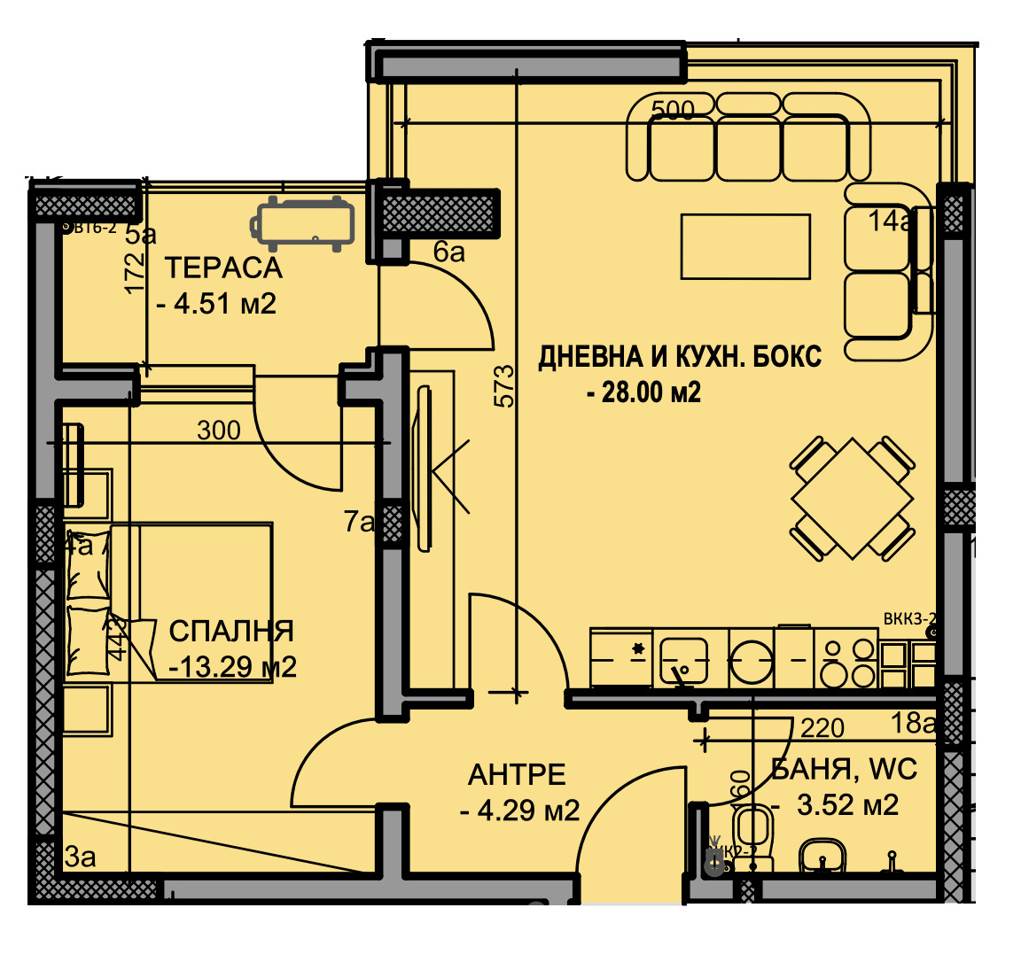 ➡Апартаментът се състои от антре, баня с тоалетна, спалня, дневна с кухня и трапезария, тераса и е с обща площ от 77,47 кв.м.