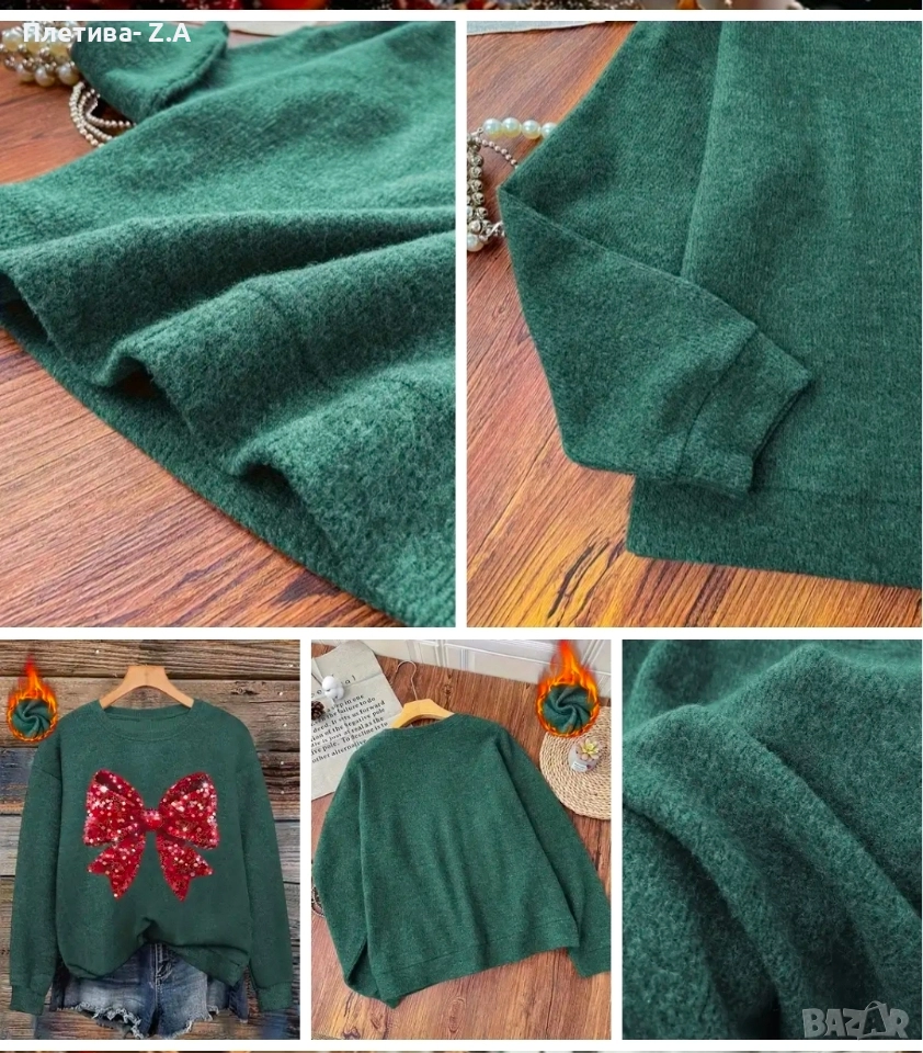 Топъл и мек коледен пуловер в тъмнозелен цвят, с ефектна голяма панделка отпред. Панделката изглежда като пайети, но е принт, което прави модела лек и удобен за ежедневно носене.