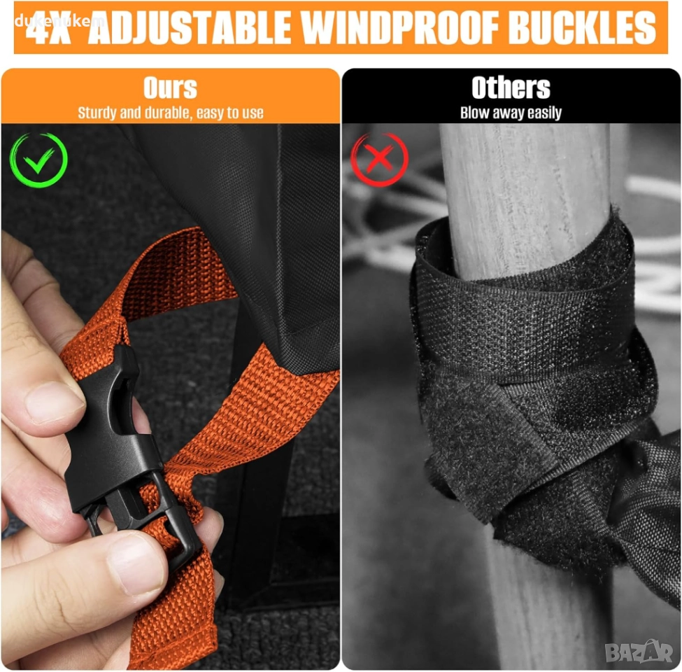 Двойна вятърна защита: вграден стягащ шнур + 4 регулируеми катарами за максимална стабилност при вятър.
