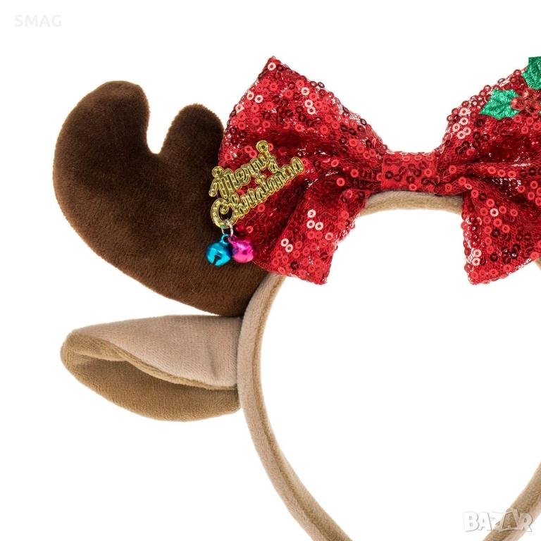 Празнична коледна диадема в бежово с кафяви еленови рога, меки ушички и ефектна червена панделка с пайети. Декорирана е с надпис Merry Christmas и малки звънчета, които добавят весело коледно настроение. Идеална за партита, тържества, коледни снимки и училищни мероприятия.