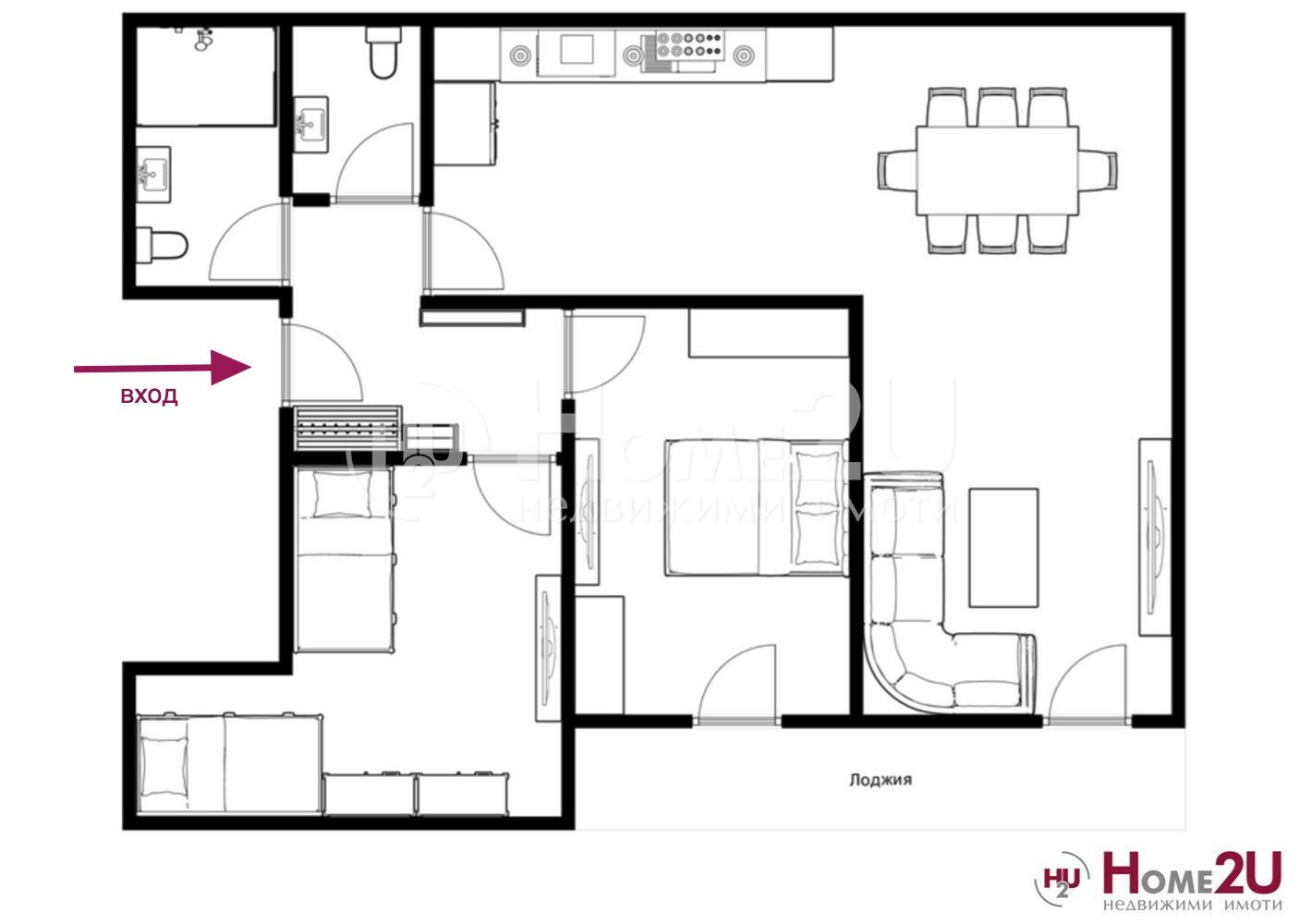 Впечатляващата дневна от 40 кв.м. разполага с френски прозорци, осигуряващи максимално естествено осветление. Пространството позволява удобно зониране на кухненски бокс, трапезария и кът за почивка.