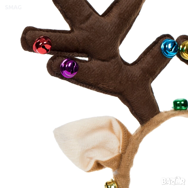 Празнична коледна диадема с кафяви еленови рога, ушички и цветни звънчета – подходяща за партита, снимки и зимни празненства. Лека, удобна и стабилна, тя добавя весел акцент към всяко коледно облекло.