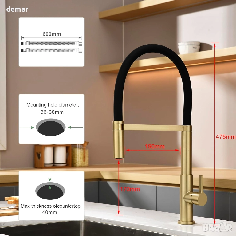 Този кухненски смесител е с издръжливо хромирано покритие, гъвкав силиконов маркуч, въртящ се на 360°, за пълно покритие на мивката и аератор, който може да се сваля за рутинно почистване. Месинговата му конструкция гарантира устойчивост на корозия и ръжда, докато керамичният патрон осигурява стабилна и плавна работа с намален риск от течове. Дизайнът позволява лесна ежедневна поддръжка, а смесителят се предлага с всички необходими аксесоари и стандартна връзка G1/2 за лесен монтаж.