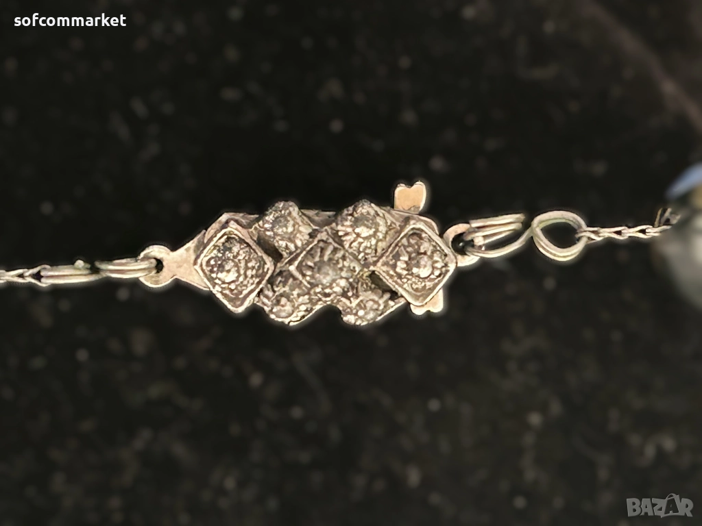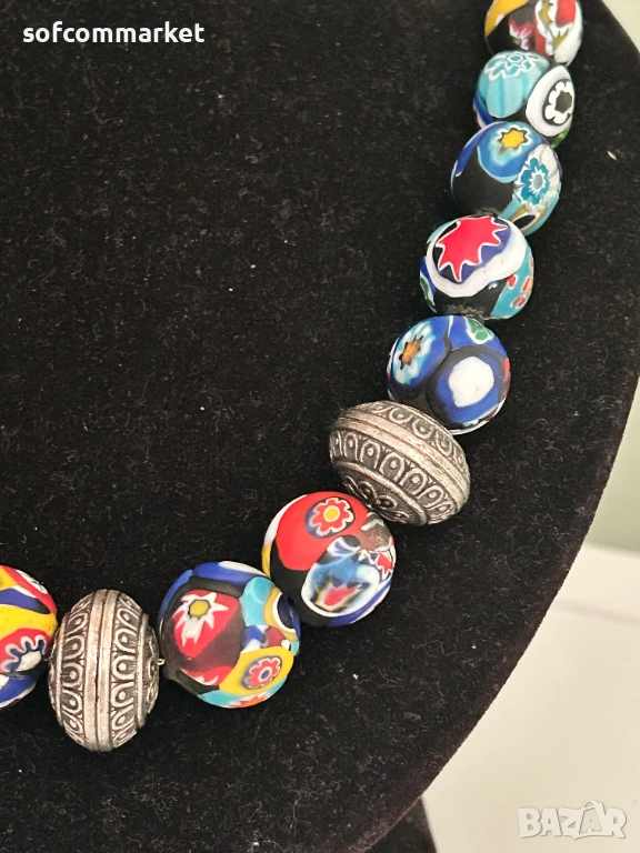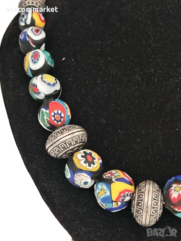 Венецианска огърлица от стъклени мъниста тип "милефиори" (millefiori-италиански означава "хиляда цветя".). Тези бижута са известни със своите сложни, цветни флорални дизайни, които се постигат чрез уникална древна техника на стъклодухане, произхождаща от остров Мурано, Венеция.Включва и метални мъниста със сложни релефни орнаменти.