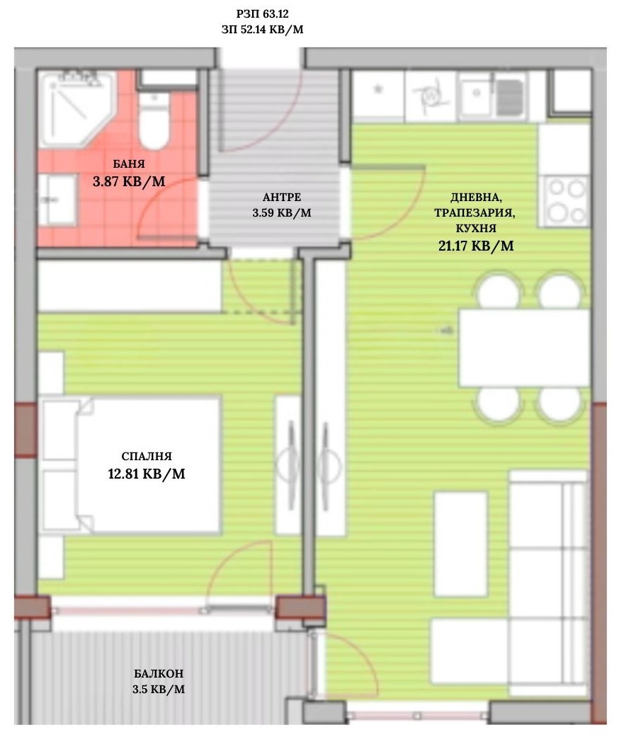 🔷 ЗП: 52.14 кв.м. | РЗП: 63.12 кв.м.