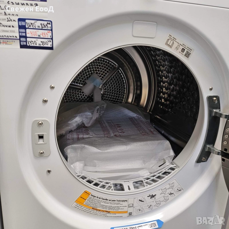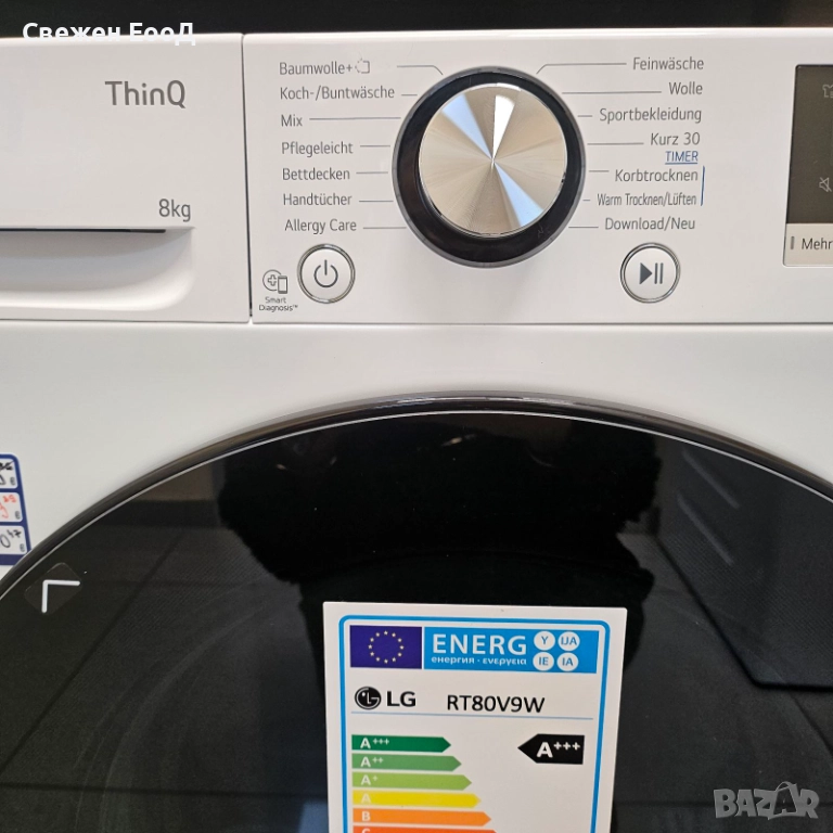 Сушилня с термопомпа LG RT80V9W, клас C, капацитет 8 кг: Технология с двойна инверторна термопомпа Технология с двойна инверторна термопомпа Благодарение на технологията с термопомпа, прането се суши ефективно дори при относително ниски температури от 55 °C. Това особено нежно сушене помага и за пестене на до 50% енергия. Нашите сушилни сушат особено нежно дори деликатни тъкани и намаляват свиването на прането. Сензорно сушене Сензорно сушене Сензорно сушене Сензорно сушене Сензорни сензори за влажност надеждно откриват колко мокро е прането ви и автоматично настройват оптимално времето за сушене. Свободно регулируема функция за време или таймер е налична за по-малки количества пране. Автоматичен самопочистващ се кондензатор. Автоматичен самопочистващ се кондензатор. Сушилните LG почистват кондензатора автоматично до 3 пъти на процес на сушене. Власинките просто се отмиват. Кондензаторът остава чист и суши надеждно с ниска консумация на енергия и постоянна производителност на сушене. Хибридна система Хибридна система С функцията Hybrid можете да избирате дали искате да пестите време или енергия всеки път, когато го сушите. Режимът за време изсушава прането ви нежно и ефективно за нула време, докато енергийният режим трае малко по-дълго, но е особено енергоспестяващ. Така че оставате гъвкави по всяко време и можете да изберете правилния режим в зависимост от ситуацията. Двоен филтър Сушилните с двоен филтър LG са оборудвани с два филтъра за мъх, които позволяват лесно и ефикасно почистване и удължават живота на вашата сушилня LG. Грижа за алергени Грижа за алергени Някои сушилни LG са оборудвани с програма за грижа за алергени и следователно са особено подходящи за алергени и отговарят на най-високите хигиенни изисквания. За сушене на прането ви с тази програма температурата е постоянна между 60 и 65 °C по време на сушене за приблизително 60 минути.