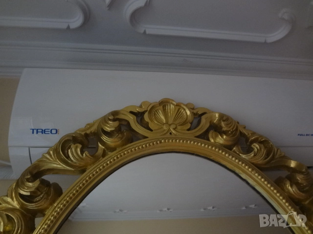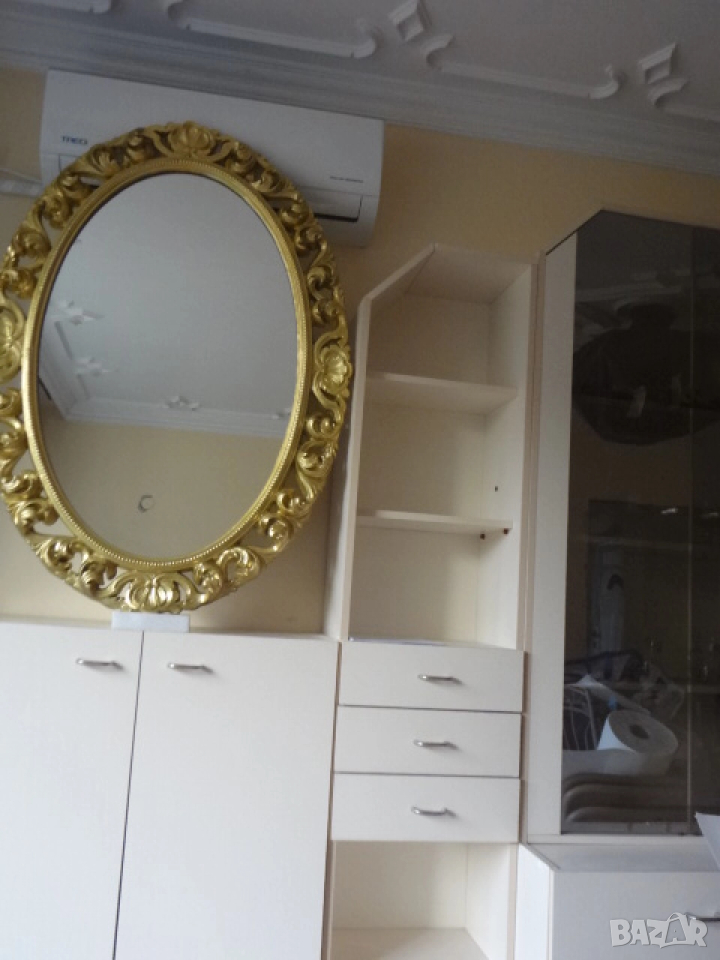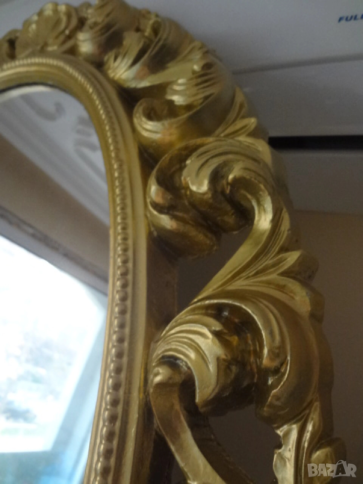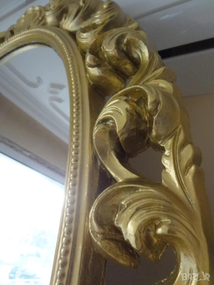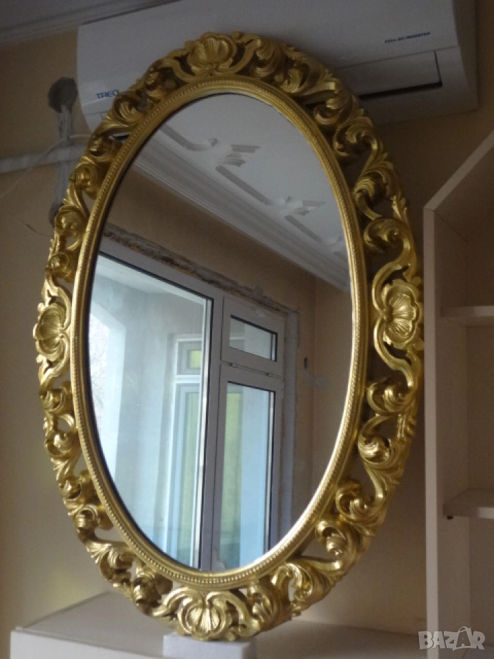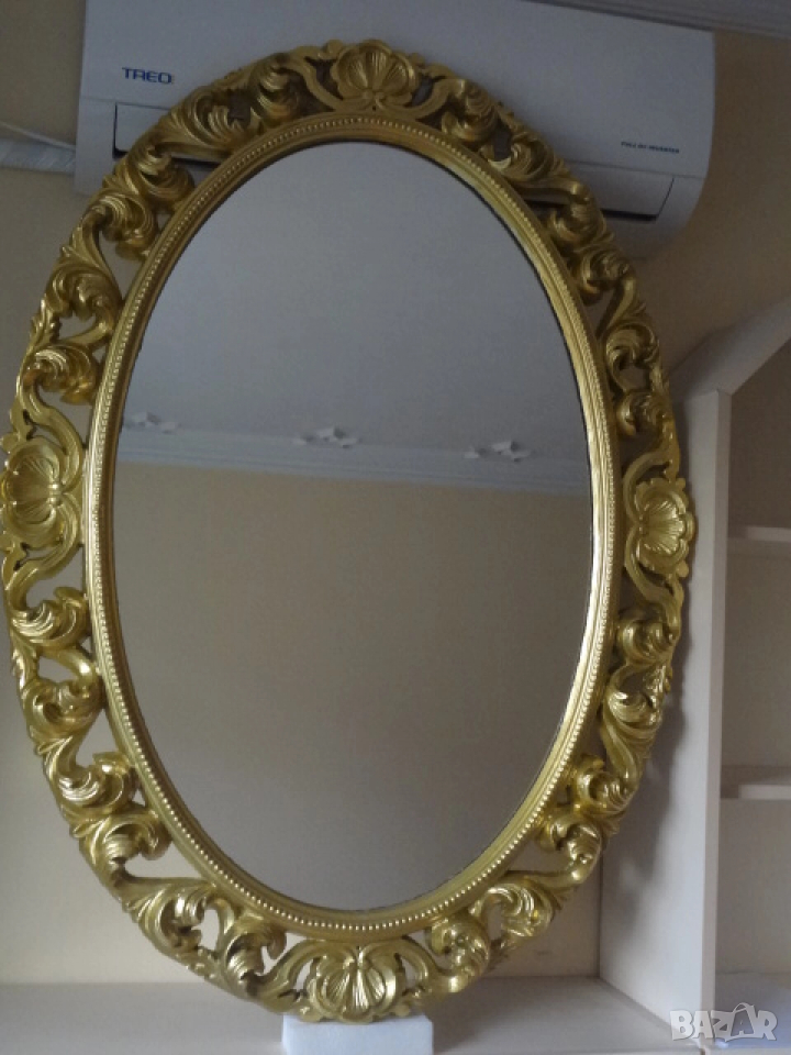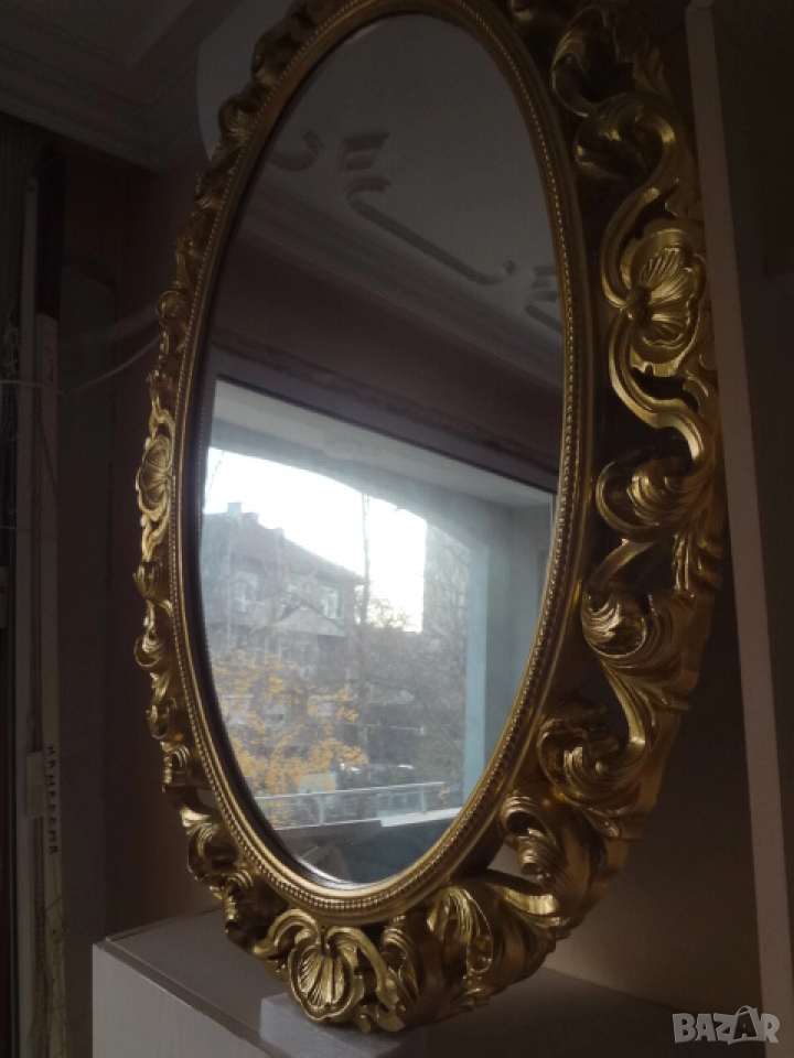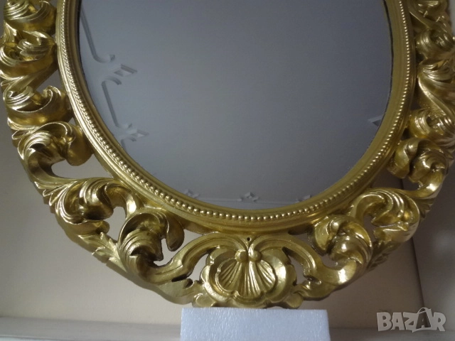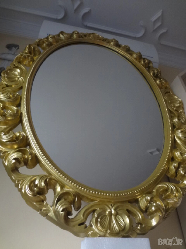 Чисто ново голямо елипсовидно огледало в бароков класически стил. Има изящна много релефна и орнаментална рамка в цвят старо злато. Това разкошно и блестящо винтидж огледало ще придаде класа и уют на всеки дом. Размери - височина - 110 см.; ширина - 80 см. в най-широката си част.