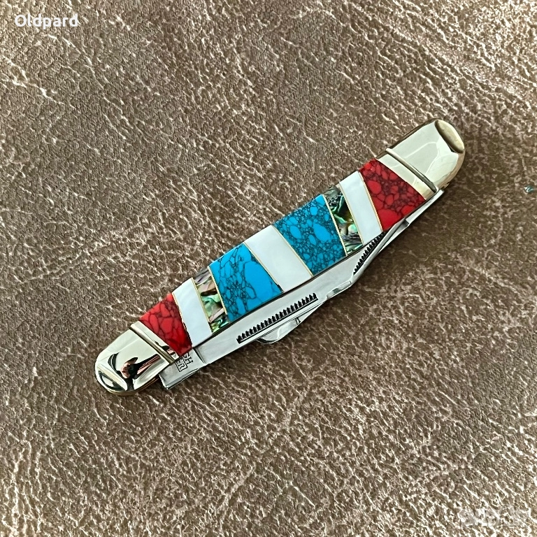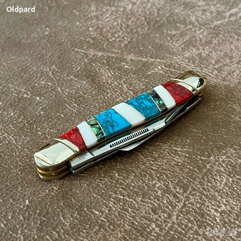 Голям джобен, сгъваем нож Texas Stockman RR2415. Дължина в сгънато состояние - 12,4 см. Три остриета, изработени от неръждаема стомана 440A с огледален блясък. Подложка от никелово сребро. Дръжката е изработена от естествен камък в различни цветове и мида със седеф. Предлага се в подаръчна кутия. Това е красив, ярък и функционален подарък, особено за Коледа или Нова година.