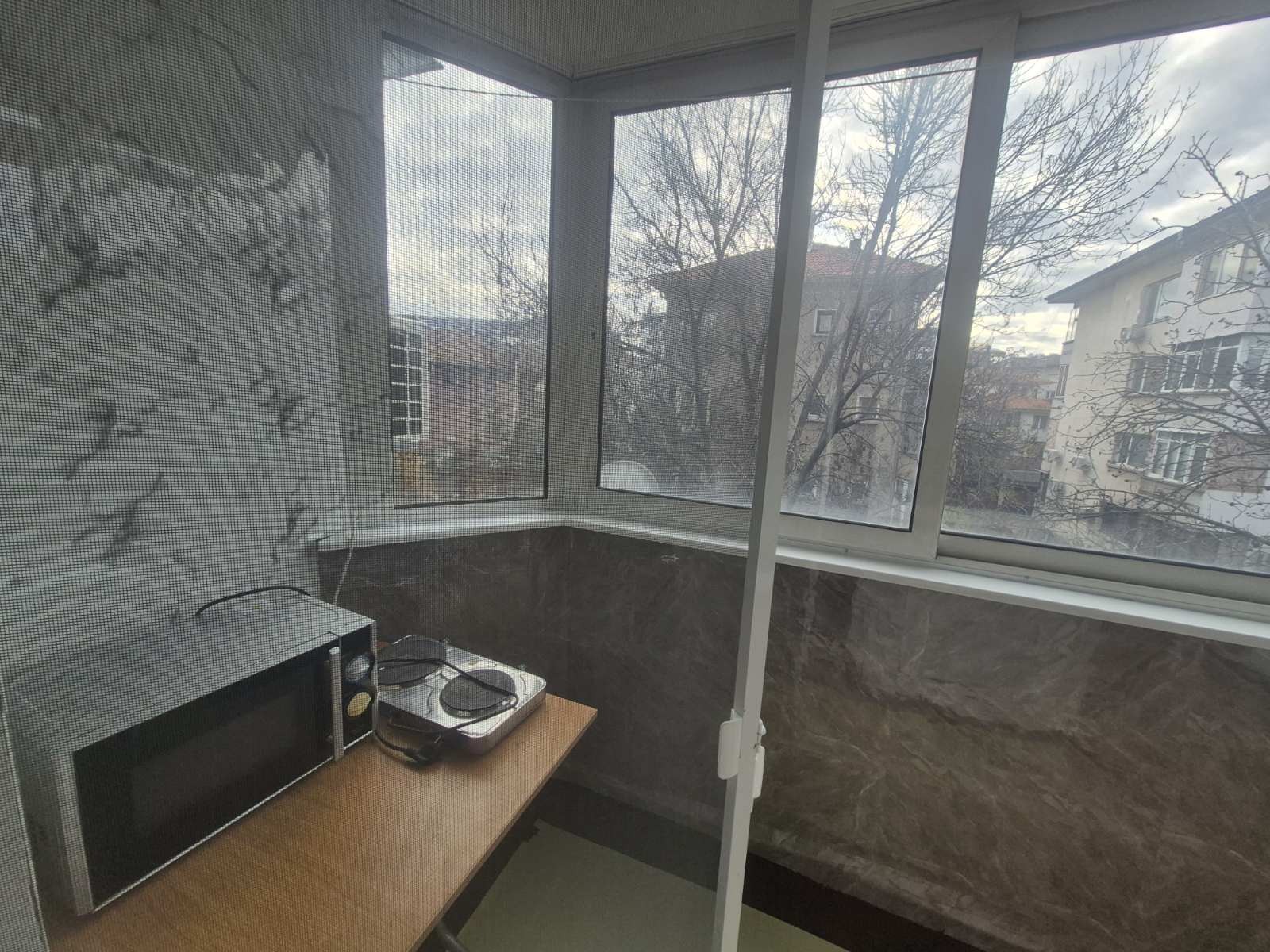 Кухненски бокс на остъклена тераса с шкафове, мивка, котлон и микровълнова