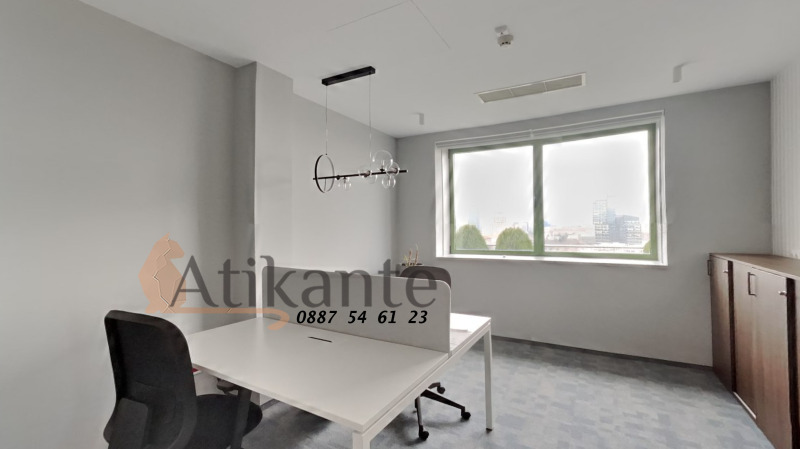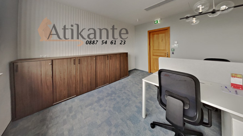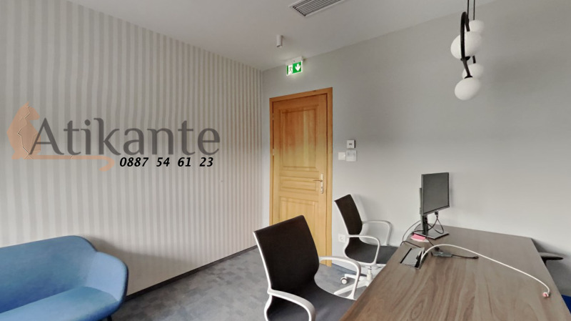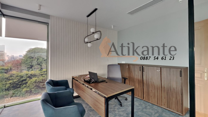 Офисът е напълно обзаведен и предлага всичко необходимо за комфортна и продуктивна работна среда бюра, столове, шкафове за документи, дивани, маси и оборудвана кухня.