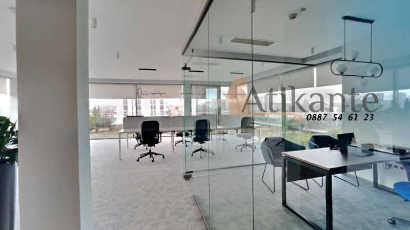 Атиканте Естейтс представя на вашето внимание изключително луксозен и безкомпромисно поддържан офис под наем, разположен на последния 8-ми етаж на престижна офис сграда, с обща площ 293 м² и панорамна тераса около целия офис!
