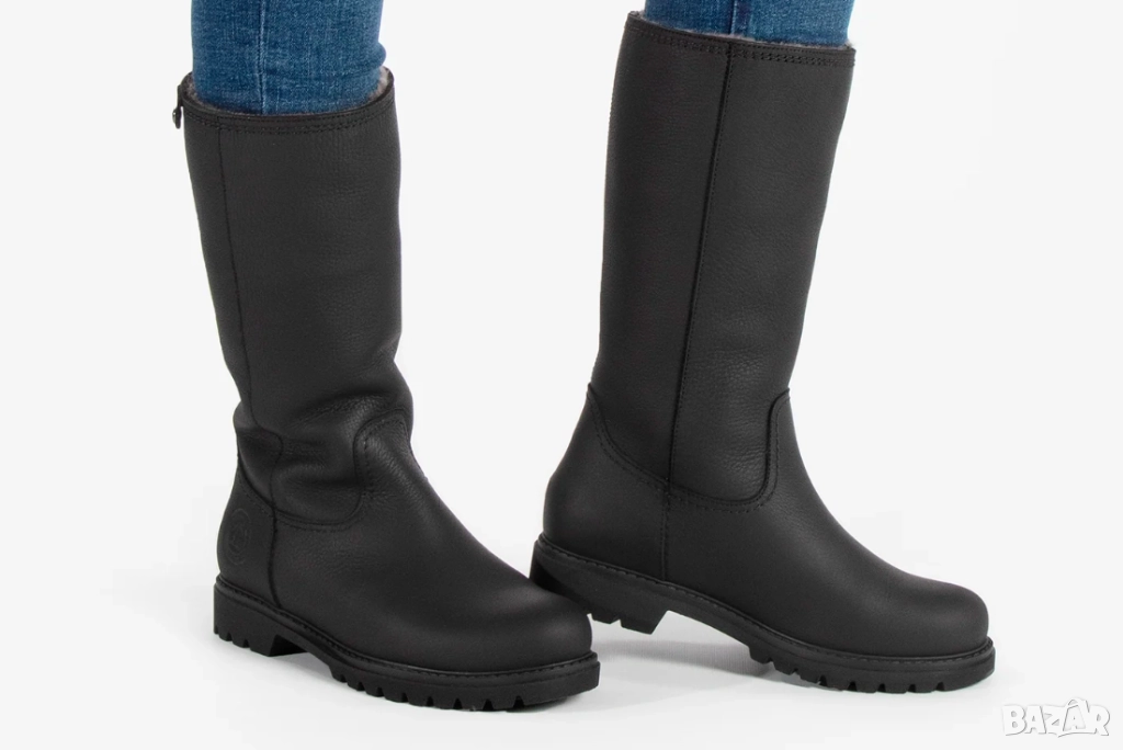 Дамски равни боти. ВОДОУСТОЙЧИВИ. Черна кожа напа трева. Хастар от овча кожа. Сваляща се анатомична стелка. Естествена, гъвкава и издръжлива гумена подметка. Височина на дръжката: 28 см. Височина на тока: 4 см. 100% Произведено в Испания.