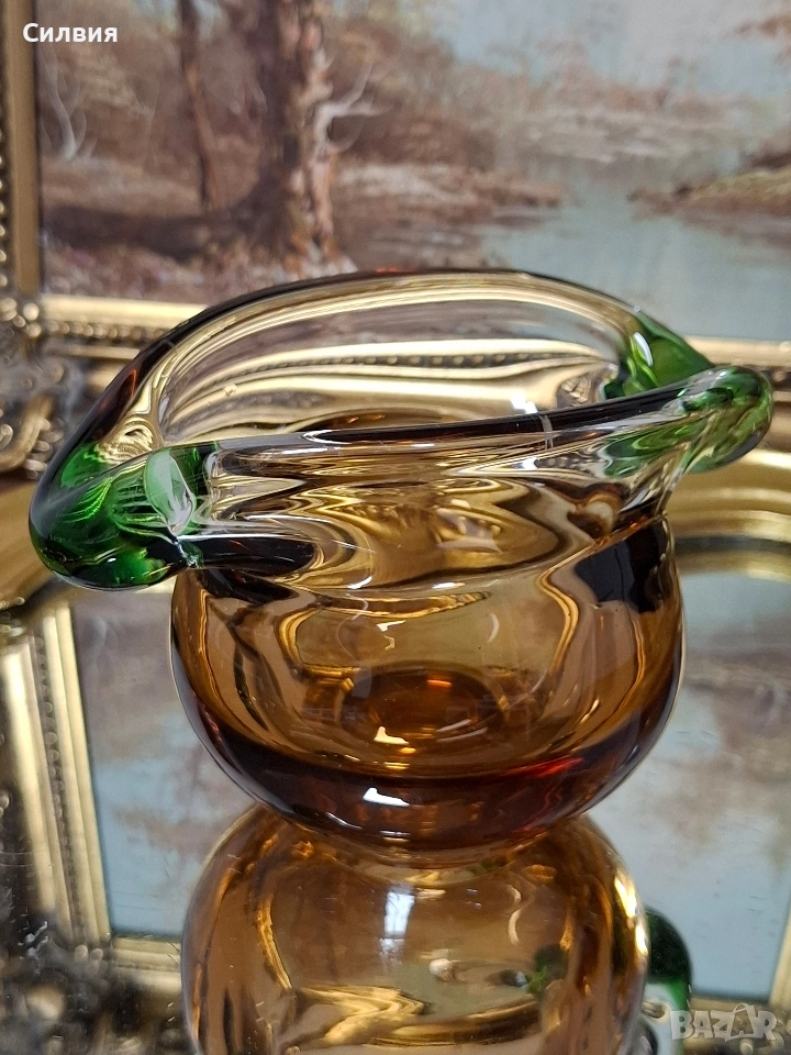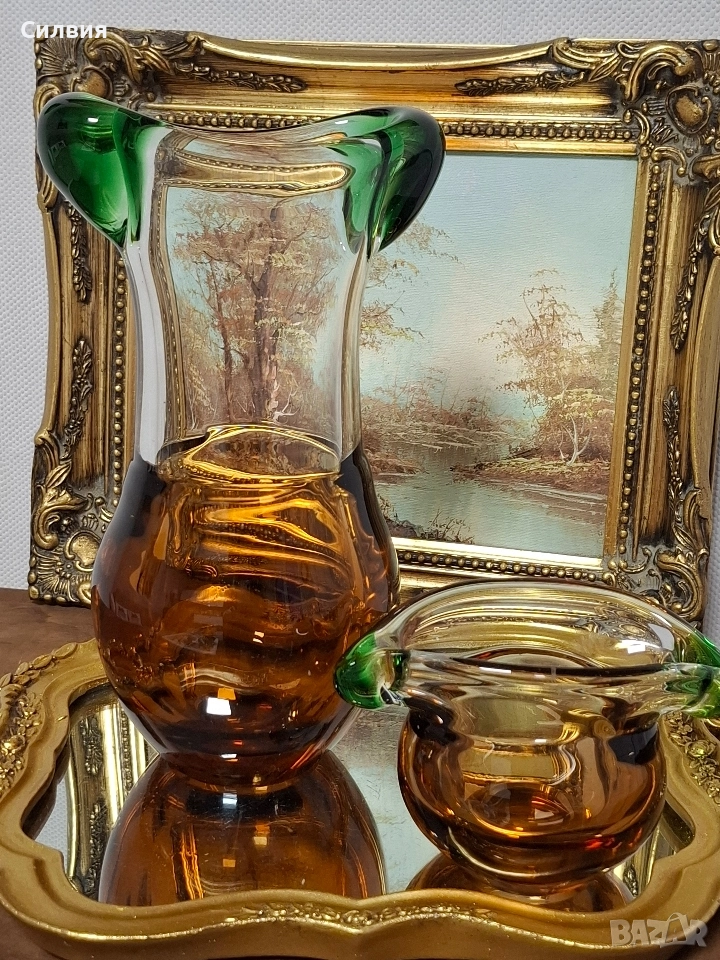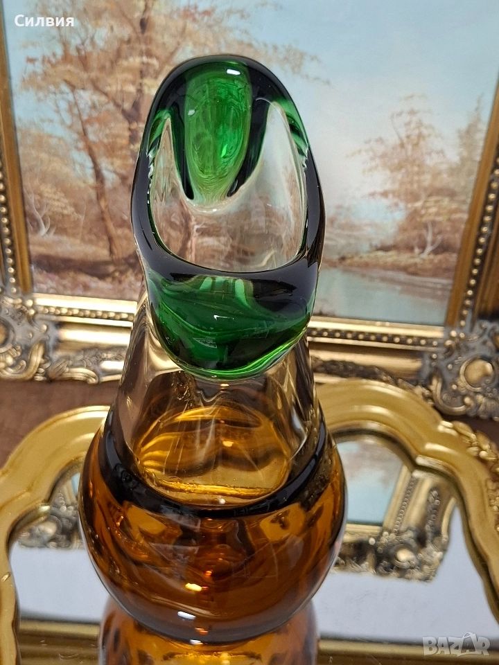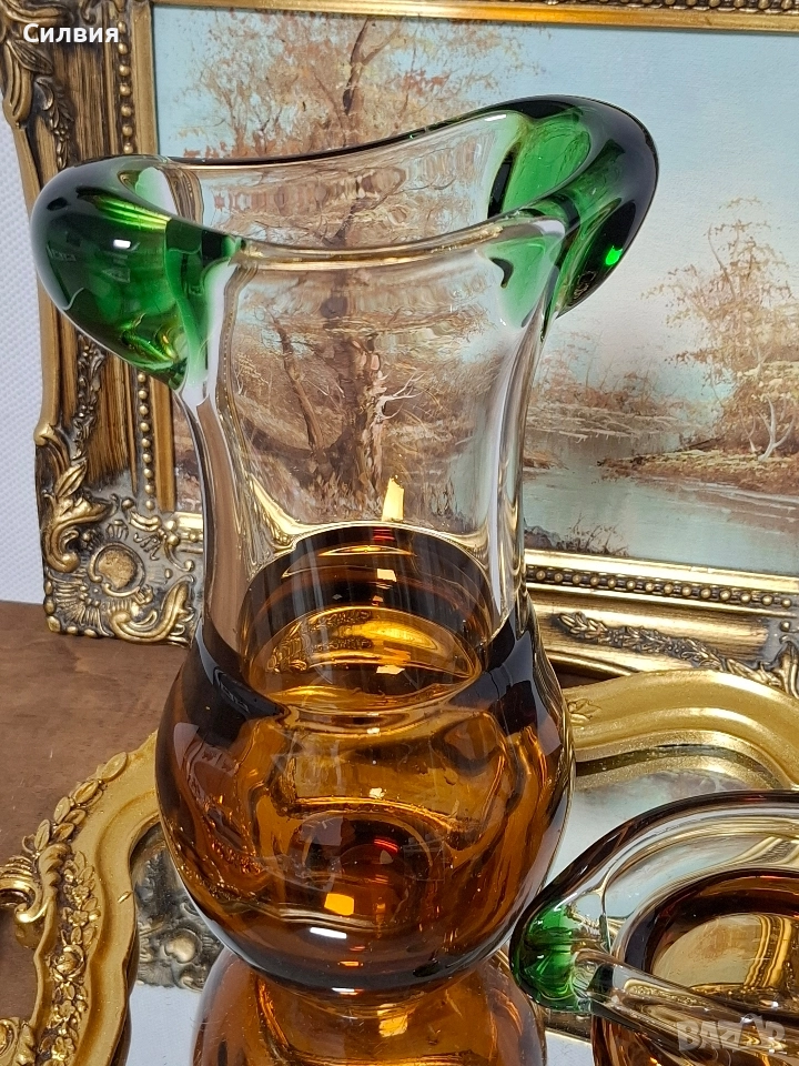 Комплект Дизайнерско Арт Стъкло ŠKRDLOVICE (Ладислав Палечек) Продавам изключително рядък и стилен комплект от две арт стъклени изделия от световноизвестната чехословашка фабрика Škrdlovice (често наричана и Beránek Glass). Дизайнът е в характерен стил, приписван на майстора стъклодув Ладислав Палечек (Ladislav Paleček). Този комплект е перфектна инвестиция за ценители на Mid-Century Modern (Модерен стил от средата на 20-ти век) стъклото и чешкия дизайн. Характеристики на Дизайна (Škrdlovice): Производител: Škrdlovice Glassworks, Чехословакия (сега Чехия). Дизайнер (приписван): Ладислав Палечек (Ladislav Paleček). Период: 1960-те – 1970-те години. Техника: Ръчно духано стъкло (Free-form/Organic form). Описание на Комплекта: Комплектът е изработен в емблематичната за Škrdlovice комбинация от цветно стъкло: Цветове: Наситен, топъл Кехлибар/Тютюн (Amber/Smoke) и контрастно, ярко Изумруденозелено/Мъх (Emerald Green). Форма (Ваза/Кана): Големият съд има органична, извита форма с масивна кехлибарена основа и елегантно издължено тяло. Асиметричният ръб е оформен с плътни зелени акценти, които придават скулптурен вид. Форма (П€пелник/Купа): Малкият съд е плитък, с тежка основа и характерно асиметрично извиване, подчертано от преливащо зелено стъкло по ръба. Състояние: Отлично, колекционерско състояние, без видими чипове или пукнатини. Това не е просто стъкло, а произведение на изкуството, което носи историята на чешкия стъкларски ренесанс. Обща цена 3️⃣5️⃣0️⃣лв.178,95€ ღꕥ⊱❥─❥⊱💜✿⊱╮☆♪ ░L░o░V░e░❥─❥⊱💜✿⊱╮💜☆♪ღ💜ღ꧂ღ