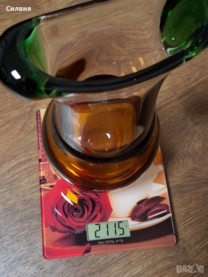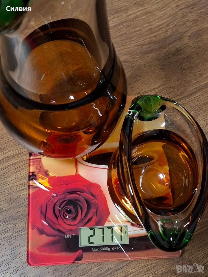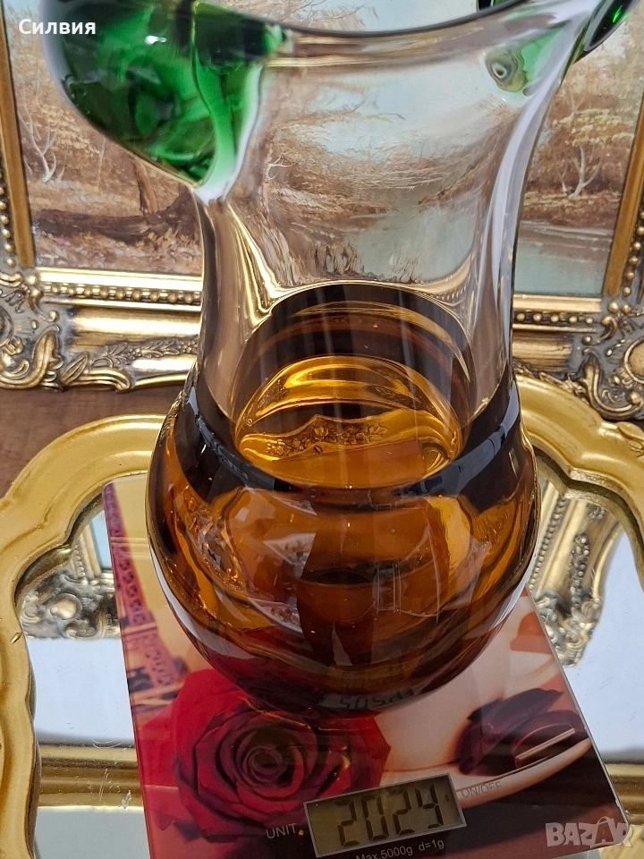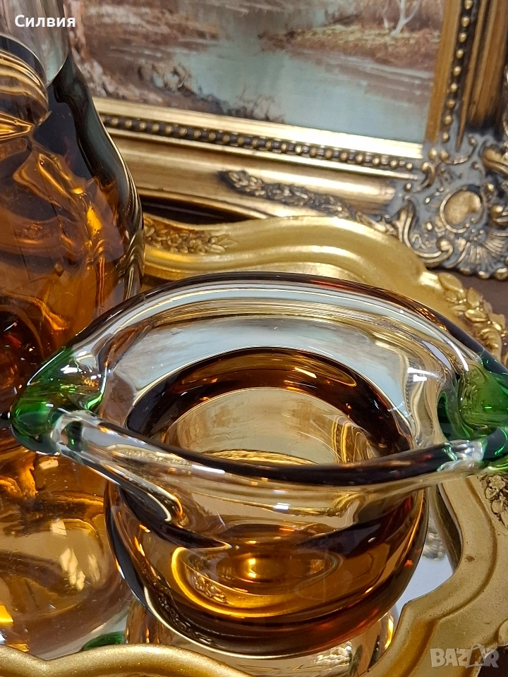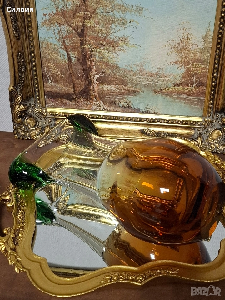 Комплект Дизайнерско Арт Стъкло ŠKRDLOVICE (Ладислав Палечек) Продавам изключително рядък и стилен комплект от две арт стъклени изделия от световноизвестната чехословашка фабрика Škrdlovice (често наричана и Beránek Glass). Дизайнът е в характерен стил, приписван на майстора стъклодув Ладислав Палечек (Ladislav Paleček). Този комплект е перфектна инвестиция за ценители на Mid-Century Modern (Модерен стил от средата на 20-ти век) стъклото и чешкия дизайн. Характеристики на Дизайна (Škrdlovice): Производител: Škrdlovice Glassworks, Чехословакия (сега Чехия). Дизайнер (приписван): Ладислав Палечек (Ladislav Paleček). Период: 1960-те – 1970-те години. Техника: Ръчно духано стъкло (Free-form/Organic form). Описание на Комплекта: Комплектът е изработен в емблематичната за Škrdlovice комбинация от цветно стъкло: Цветове: Наситен, топъл Кехлибар/Тютюн (Amber/Smoke) и контрастно, ярко Изумруденозелено/Мъх (Emerald Green). Форма (Ваза/Кана): Големият съд има органична, извита форма с масивна кехлибарена основа и елегантно издължено тяло. Асиметричният ръб е оформен с плътни зелени акценти, които придават скулптурен вид. Форма (П€пелник/Купа): Малкият съд е плитък, с тежка основа и характерно асиметрично извиване, подчертано от преливащо зелено стъкло по ръба. Състояние: Отлично, колекционерско състояние, без видими чипове или пукнатини. Това не е просто стъкло, а произведение на изкуството, което носи историята на чешкия стъкларски ренесанс. Обща цена 3️⃣5️⃣0️⃣лв.178,95€ ღꕥ⊱❥─❥⊱💜✿⊱╮☆♪ ░L░o░V░e░❥─❥⊱💜✿⊱╮💜☆♪ღ💜ღ꧂ღ