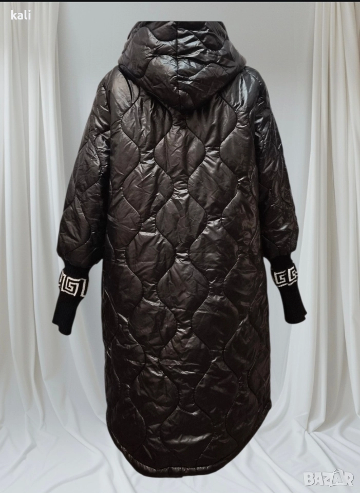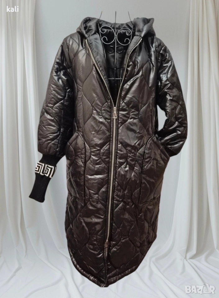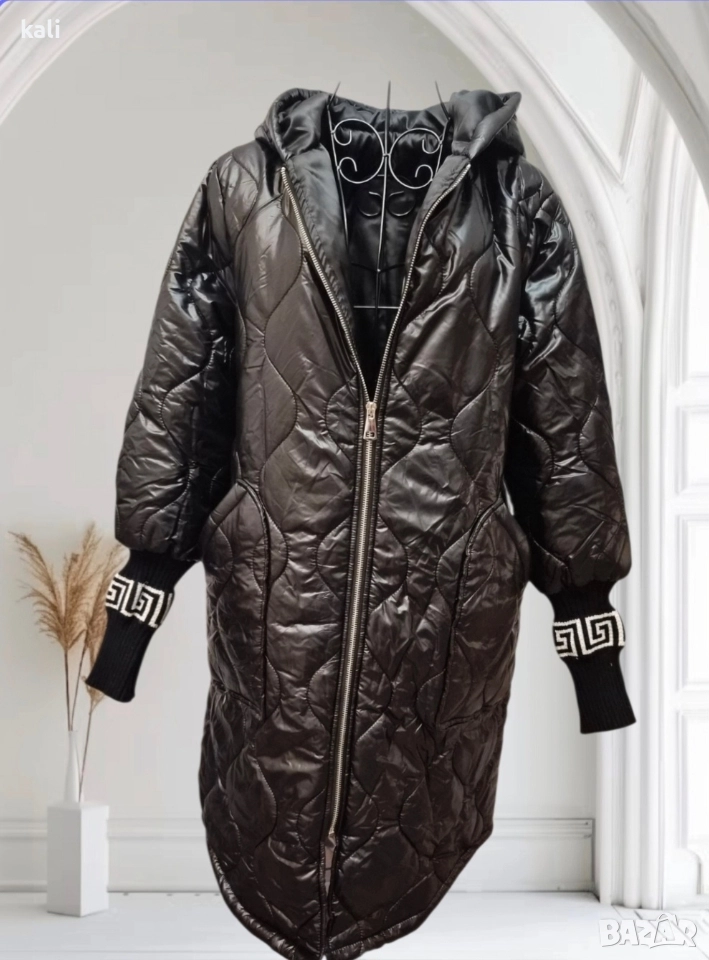 Продавам страхотно дълго яке, което съчетава удобство и топ модна визия! Моделът е в класическо черно с модерна вълнообразна капитонация, но истинският акцент са ръкавите. Те завършват с дълги, плътни плетени маншети с бял орнамент (гръцки ключ), които не само изглеждат уникално, но и пази топло. ✨