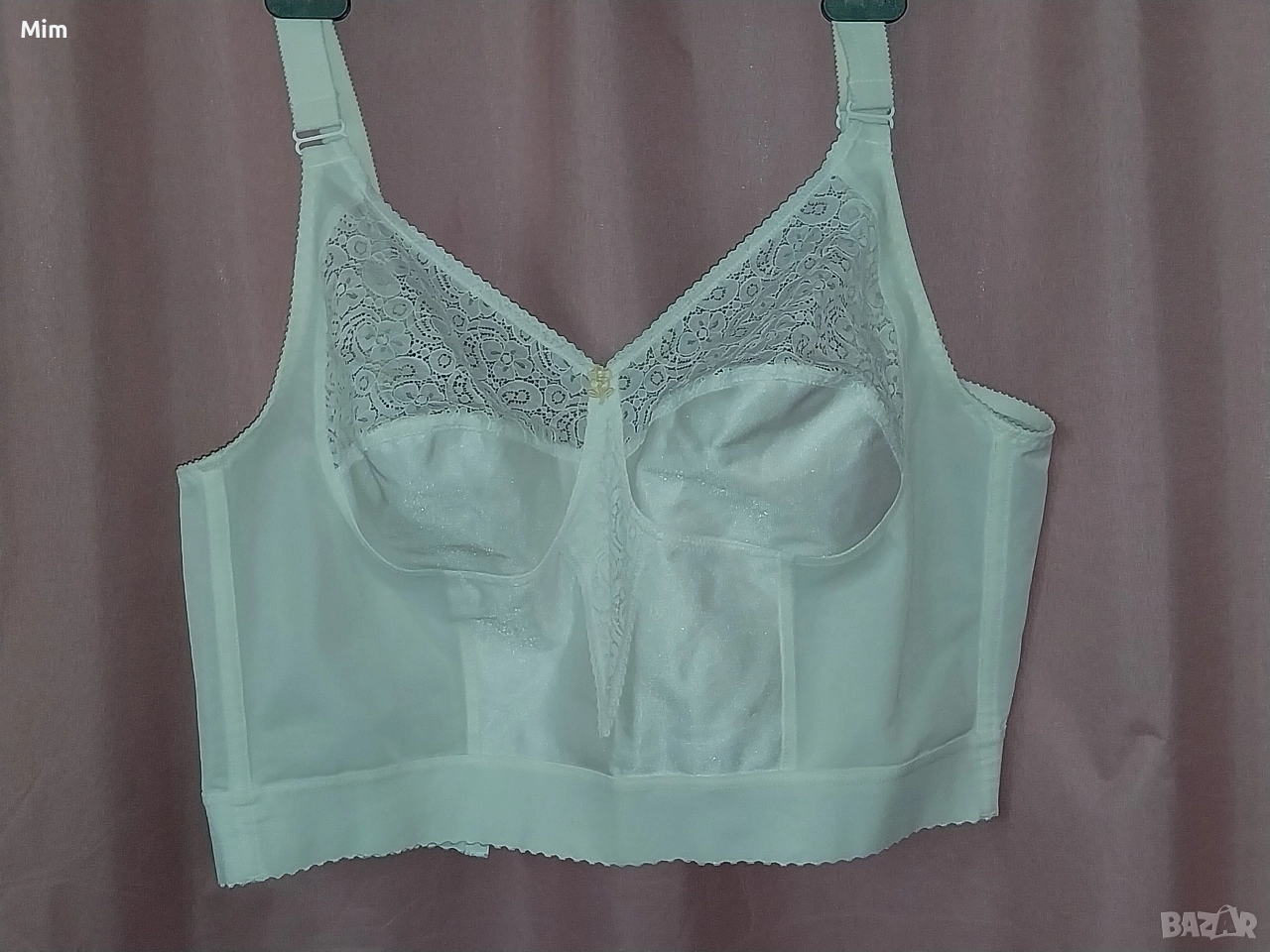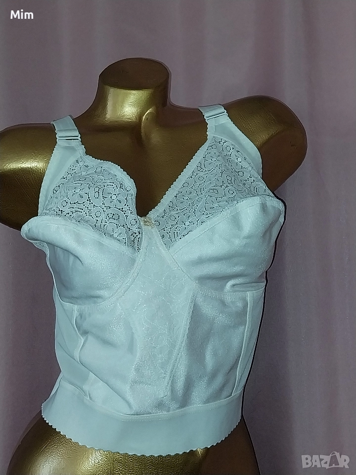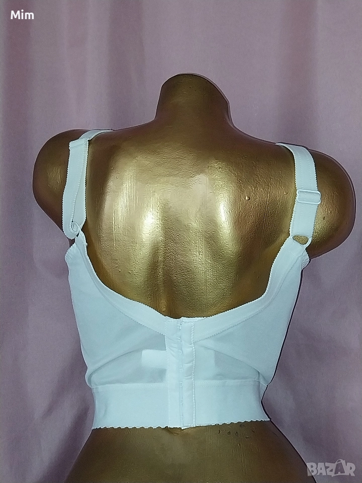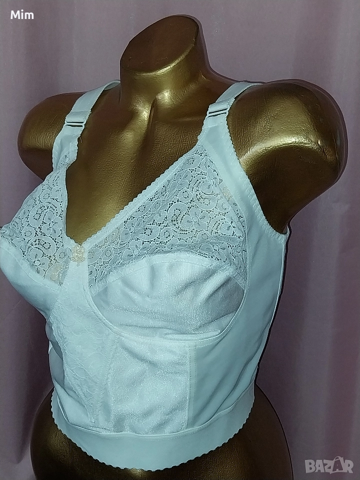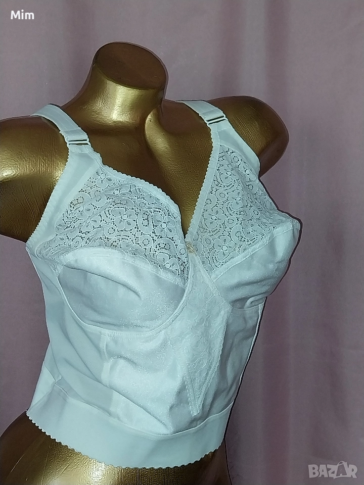 Чашката е мека без банели с широк колан за прибиране на всичко излишно и изправяне на стойката ,регулируеми презрамки, закопчаването е триредово по цялата дължина ,подгръдна до 115 см еластичност Нов без хартиен носител , последната снимка е каталожна с реалната цена.
