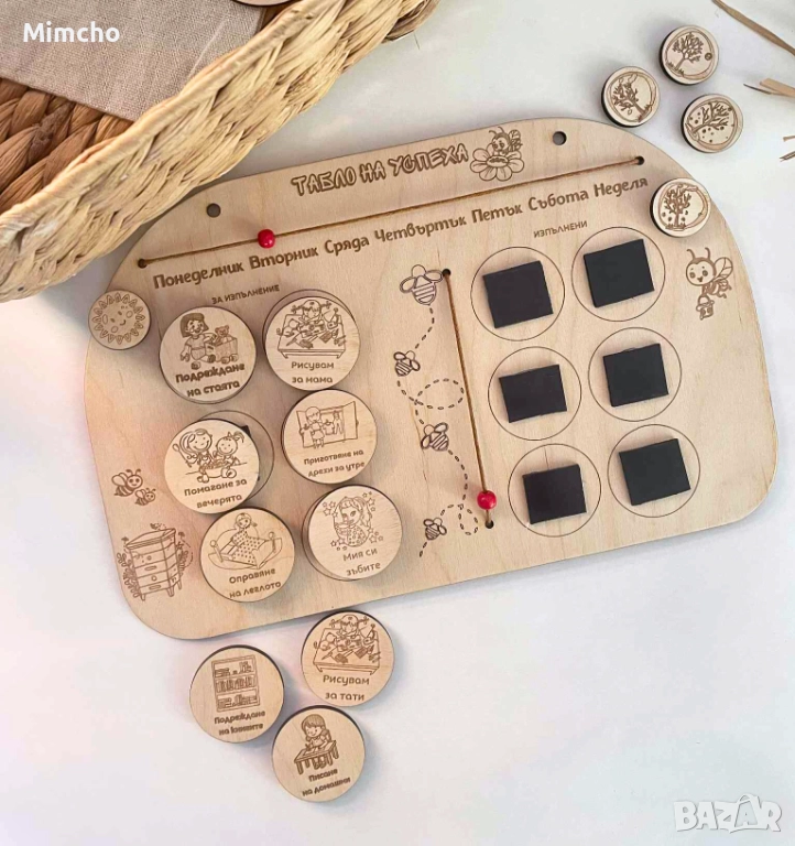 В центъра е скала с четири пчелички, където мама или татко могат да отбележат напредъка на детето според изпълнените задачи.