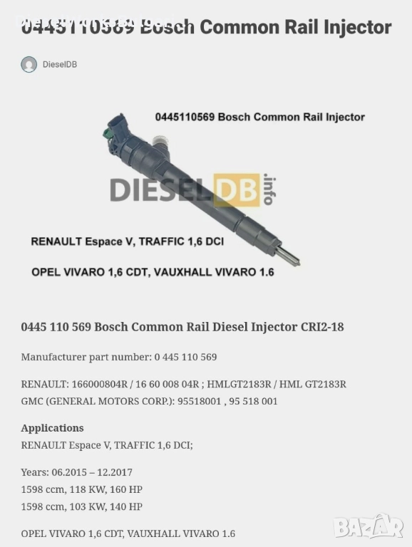 3 тествани и кодирани дизелови дюзи Bosch CRI 2-18-VCC: 0445110569 за Рено, Опел → Обява 52730931