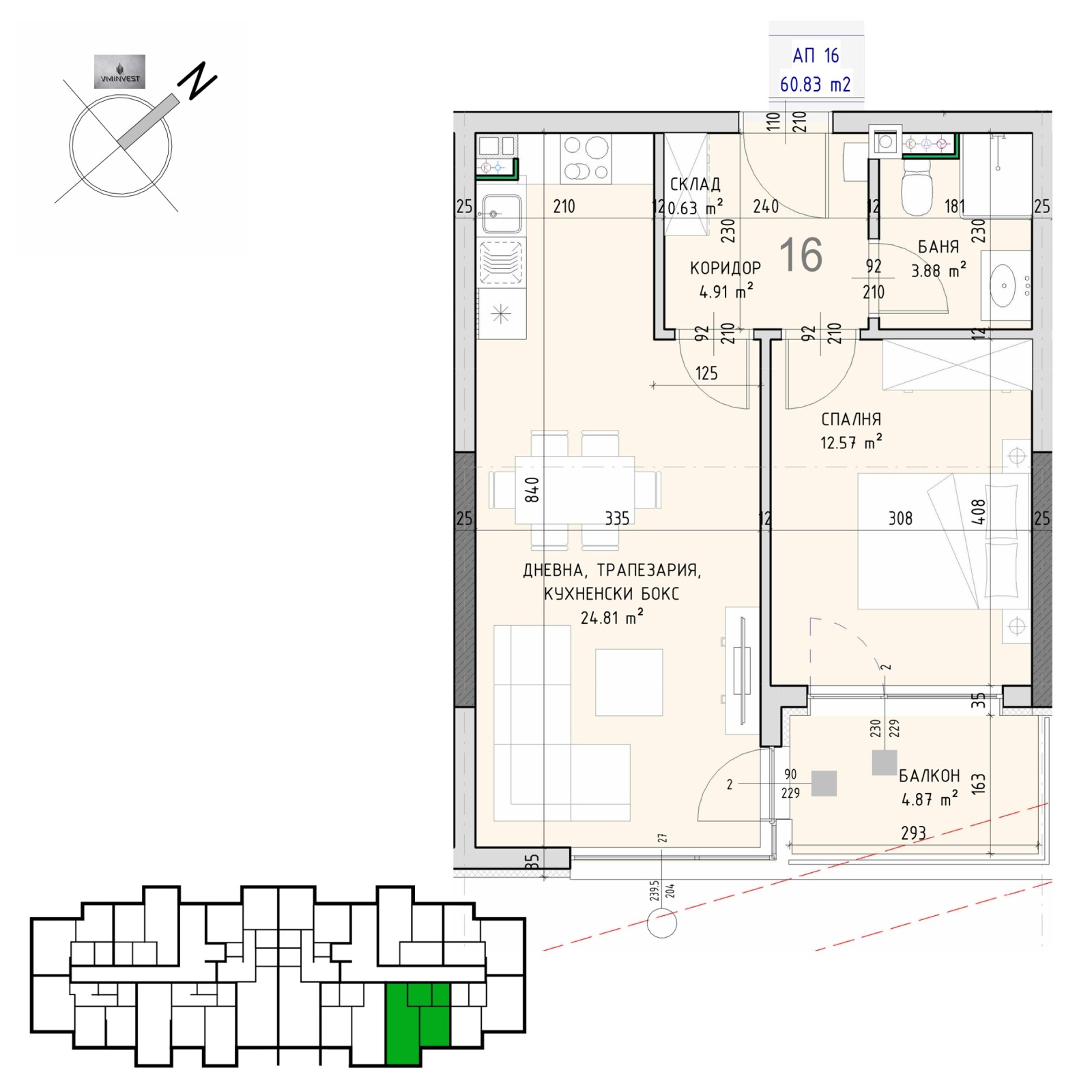 Разпределение: антре /4,91 кв.м./, дневна с кухненски бокс /24,81 кв.м./, спалня /12,57 кв.м./, баня с тоалетна /3,88 кв.м./, складово помещение /0,63 кв.м./ и балкон /4,87 кв.м./.