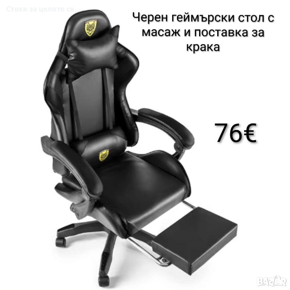 Черен геймърски стол с поставка за крака и масажна функция