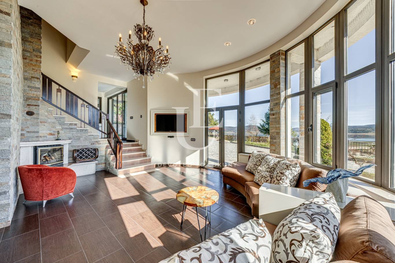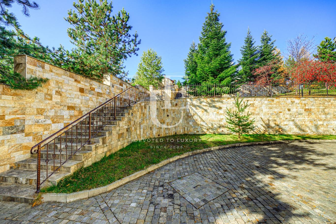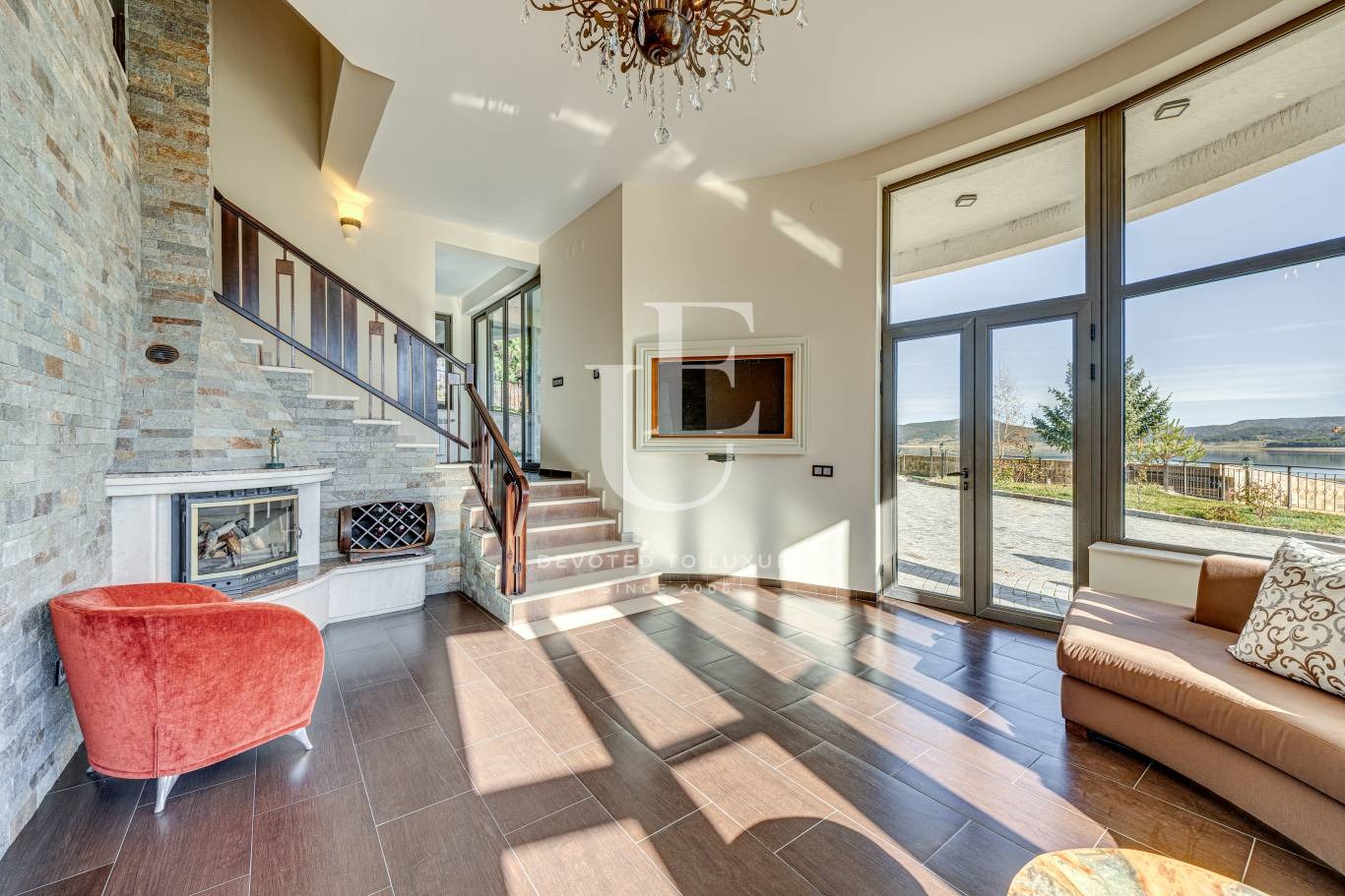Имотът е разположен на три нива, всяко от които разполага с панорамни тераси, разкриващи впечатляваща гледка към водата и околната природа. Дворът е терасиран, красиво озеленен и поддържан, създавайки усещане за хармония и спокойствие.