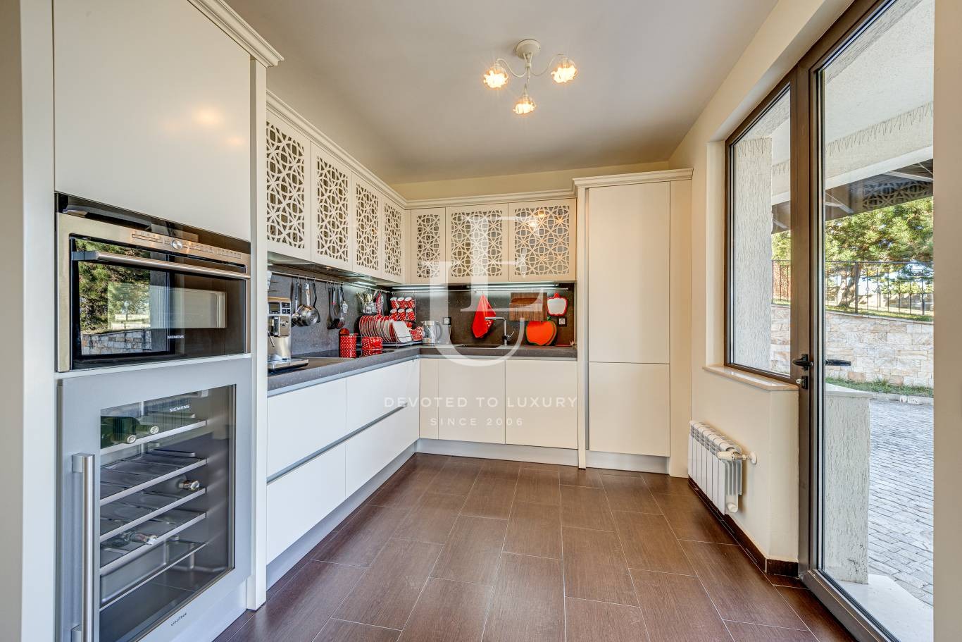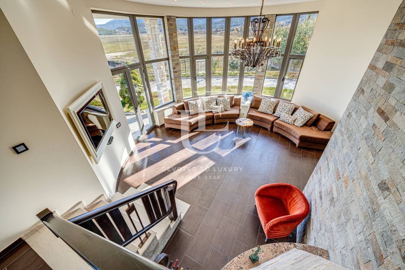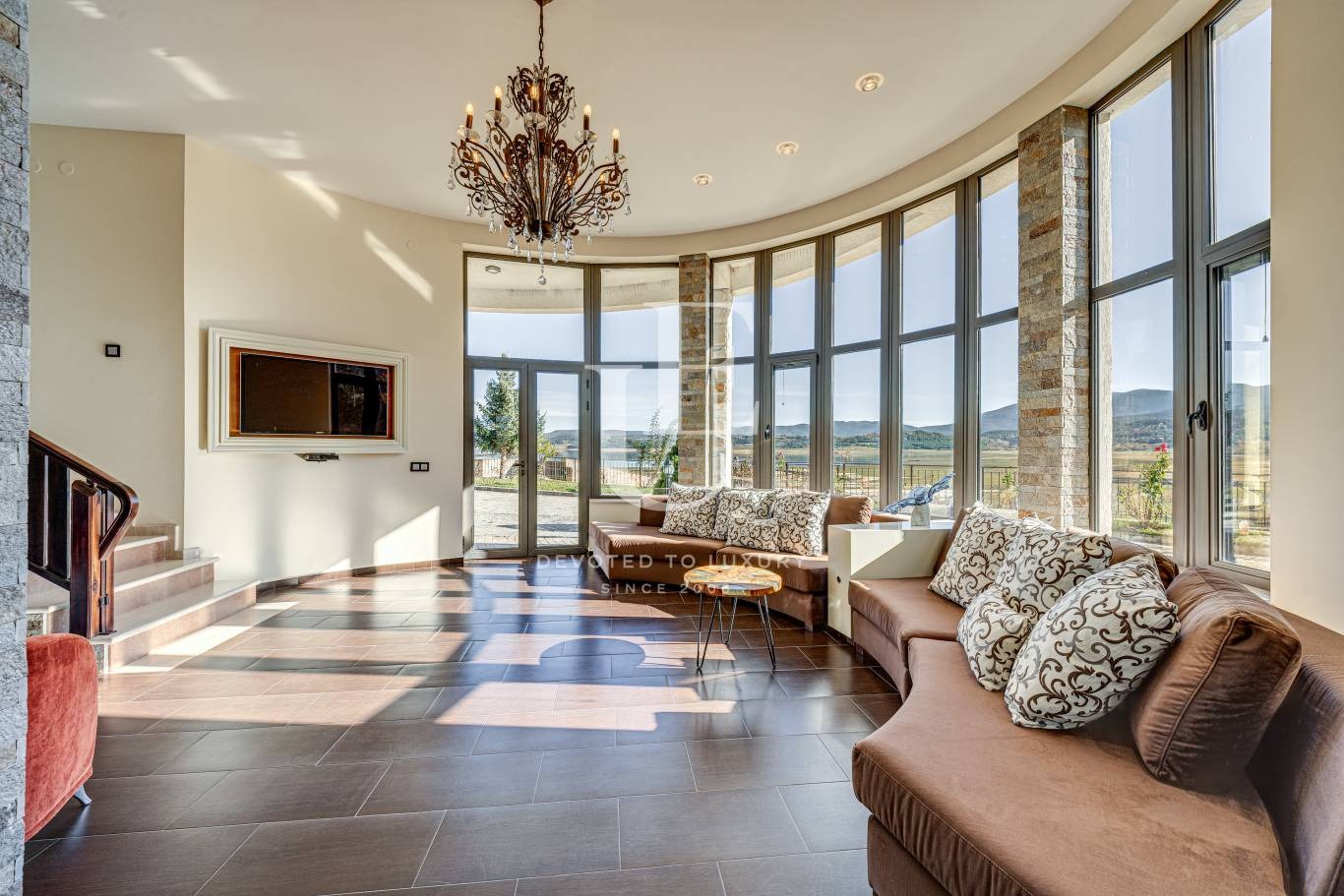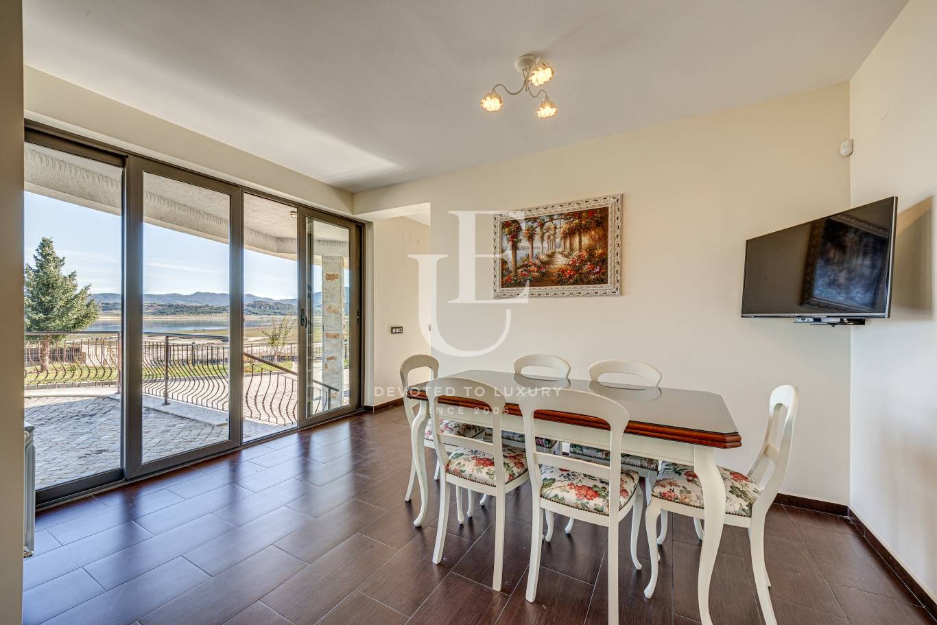 Имотът е разположен на три нива, всяко от които разполага с панорамни тераси, разкриващи впечатляваща гледка към водата и околната природа. Дворът е терасиран, красиво озеленен и поддържан, създавайки усещане за хармония и спокойствие.