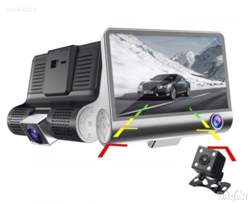 Видеорегистратор с 3 камери – Full HD 1080P, 4" дисплей, нощно виждане и G-сензор. Пълен обзор – предна, задна и вътрешна камера. Запис, паркинг мониторинг и автоматичен старт.