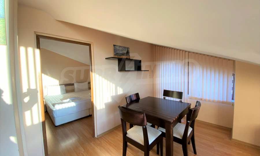 холът е скосен, мека мебел, телевизор, маса за хранене със столове, холна маса и балкон със западно изложение;