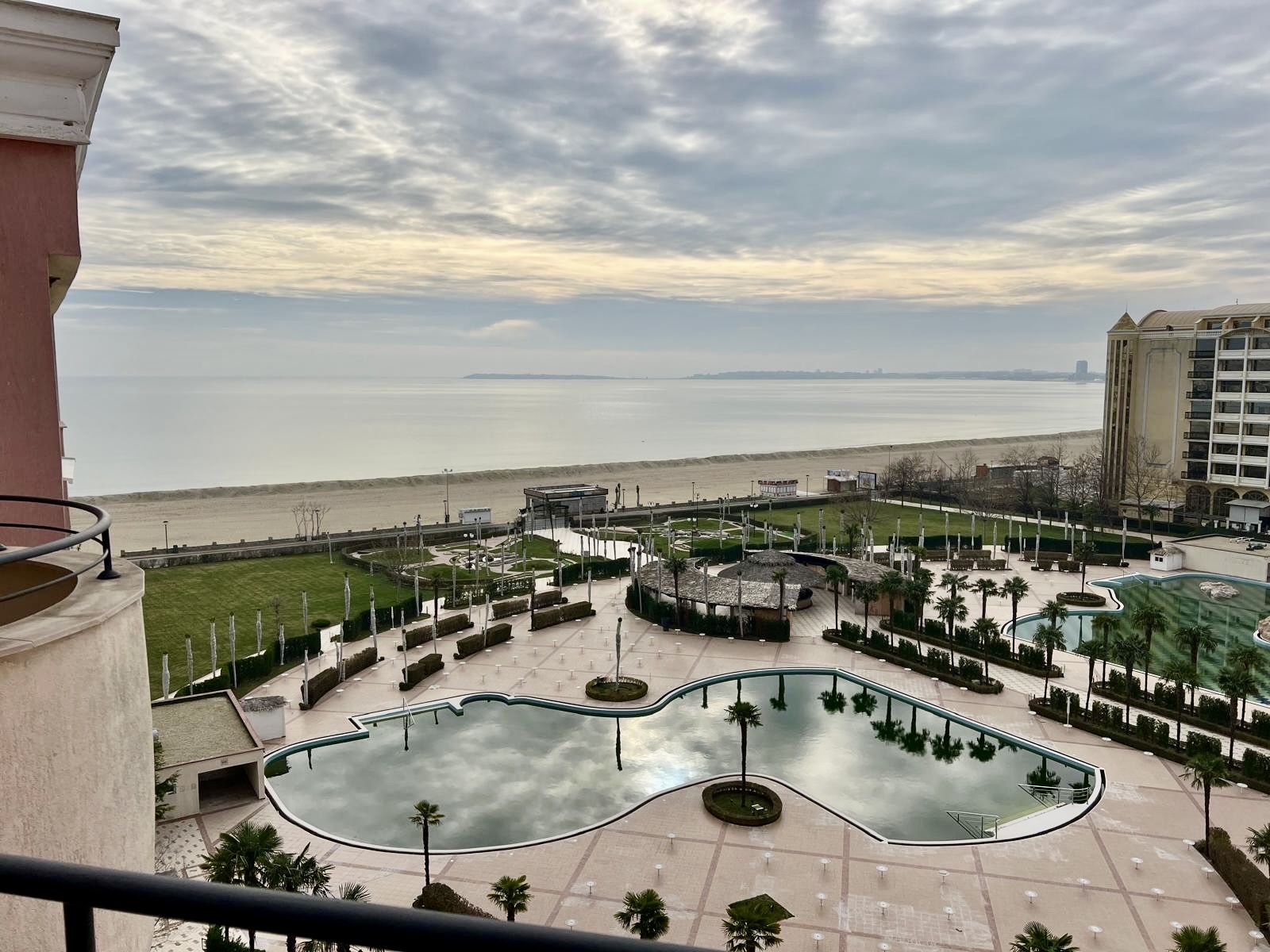 Предлагаме за продажба просторен обзаведен двустаен апартамент с прекрасна гледка към морето в луксозния комплекс Маджестик Бийч Резорт , намиращ се на първа линия на морския бряг. Апартаментът е с обща площ от 100 кв.м. и е разположен е на осми жилищен етаж в десет етажна сграда с асансьор. Състои се от просторна дневна с кухненски бокс и кът за хранене, зона за отдих, спалня, коридор, баня с вана и тоалетна, просторна тераса с прекрасна гледка към морето. Апартаментът се продава напълно обзаведен и оборудван. Хотел Маджестик Бийч Резорт е луксозен и модерен комплекс, разположен на първа линия, в северната част на к.к. Слънчев бряг. Разполага с 4 ресторанта, 4 бара, 3 басейна, спа център, фитнес център, мини голф, бизнес център, игрална зала, паркова зона, паркинг, два игрища за футбол и баскетбол. Отлична инвестиция! Управляваща компания поема ангажимент за менажиране и отдаване на апартаментите под наем. Акт 16 и Разрешение за ползване. Годишна такса 12 евро на кв.м