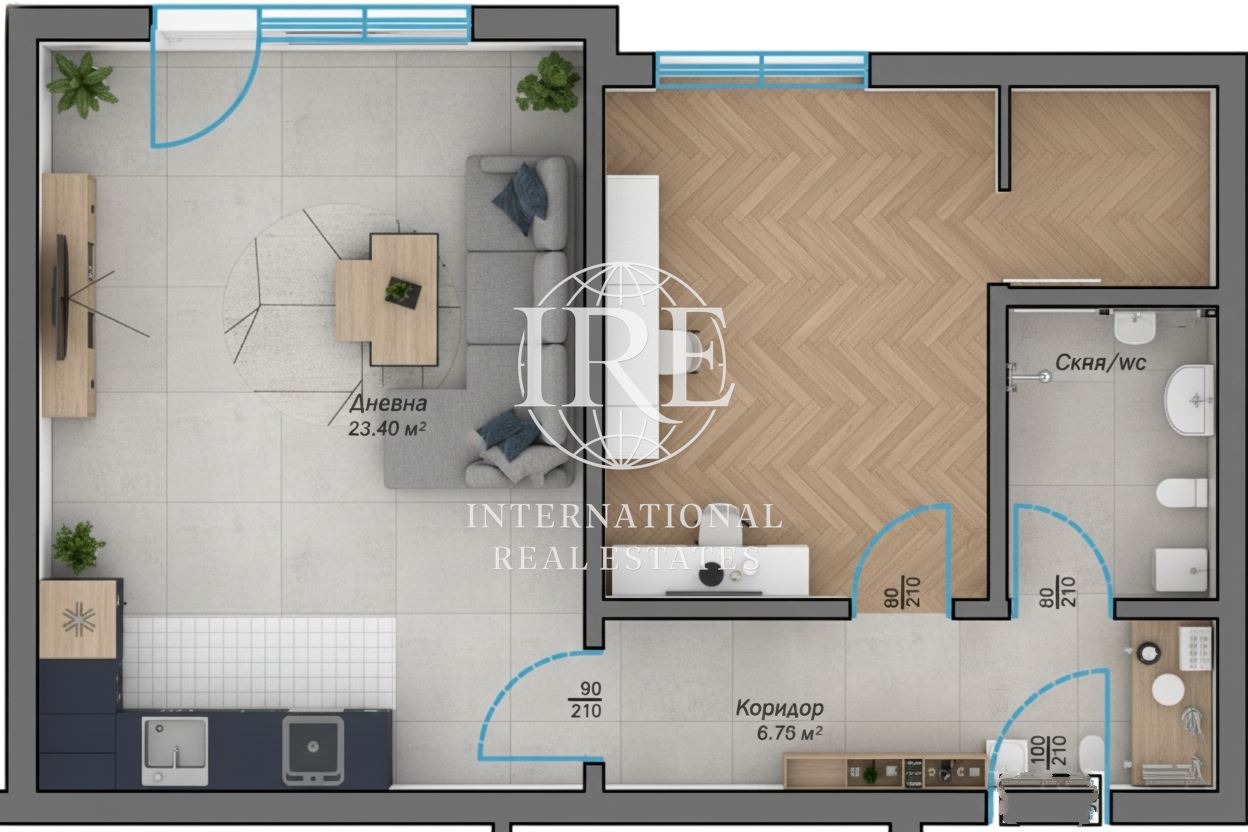 Разпределение: Жилището се състои от входно антре, просторна всекидневна, уютна спалня с прилежащ дрешник и комбиниран санитарен възел.