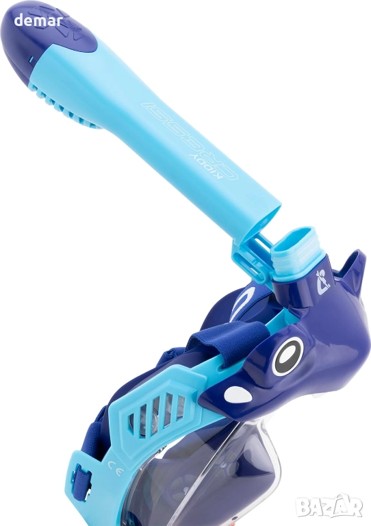 Тази детска маска за гмуркане с шнорхел за цялото лице се отличава с атрактивен дизайн, прозрачна ултрапрозрачна поликарбонатна леща за широк обзор и мека хипоалергенна силиконова пола за удобно и сигурно прилягане. Тя включва безопасна дихателна система, проектирана да намали натрупването на CO₂ и да поддържа правилен въздушен поток, подкрепена от ефективен издишващ клапан и структура на шнорхела със суха горна част, която помага да се предотврати навлизането на вода.