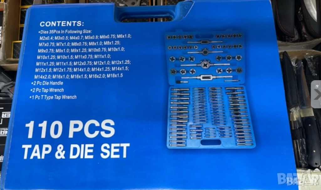 Професионален комплект от 110 части предназначен за рязане и възстановяване на вътрешни и външни резби. Подходящ за автосервизи, машиностроене, ремонтни дейнос