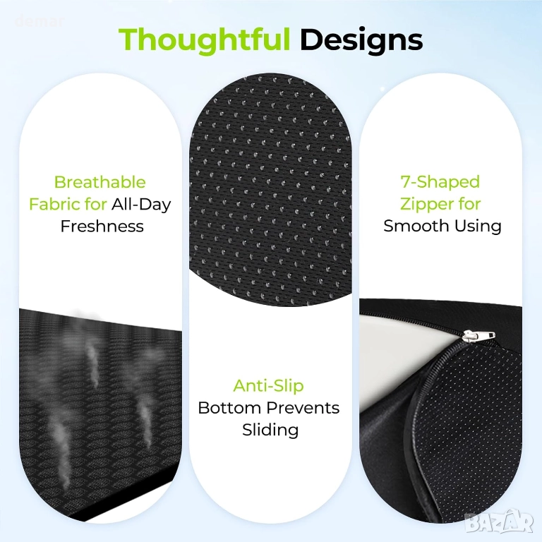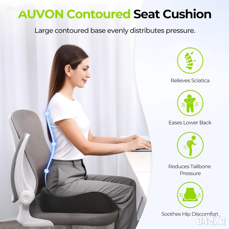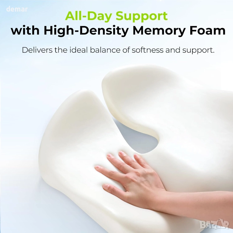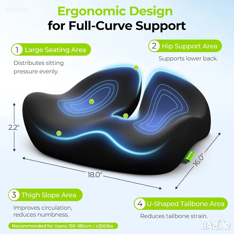 Тази възглавница за сядане е с ергономичен контурен дизайн с разширена основа, която поддържа ханша и бедрата, спомагайки за равномерното разпределение на натиска, подобряване на стойката и намаляване на дискомфорта в долната част на гърба и ишиаса по време на продължително седене. W-образната ѝ предна част облекчава компресията на бедрата, докато U-образният изрез намалява натиска върху опашната кост за целенасочено облекчение. Мемори пяната с висока плътност се адаптира към тялото за балансиран комфорт, а дишащият калъф, гладкото закопчаване с цип и противоплъзгащата се долна част улесняват ежедневната употреба. Лека и лесна за носене, тя е подходяща за повечето офис столове, автомобилни седалки, инвалидни колички и пътни седалки, за да подобри комфорта навсякъде.