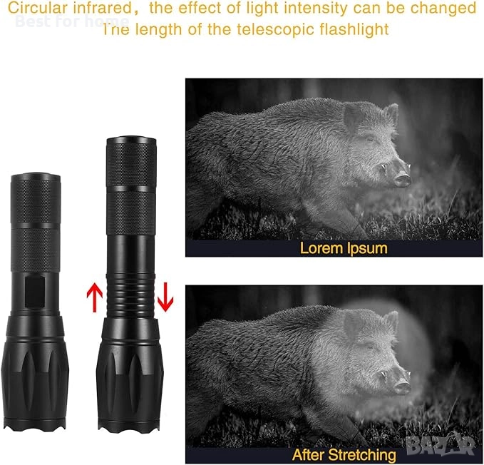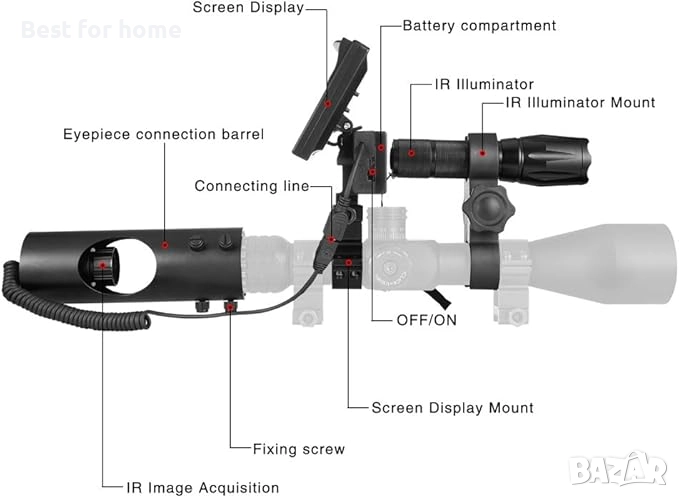【ЛЕСЕН ЗА ИЗПОЛЗВАНЕ】Инфрачервеното нощно виждане може лесно да се сглоби на мерника и е лесно за работа. Окулярите са подходящи за мерници с диаметър до 44 мм (не включва мерник за пушка). Използвайте 3 x 18650 батерии, 1 за инфрачервено фенерче и 2 за екран (не включват батерии).