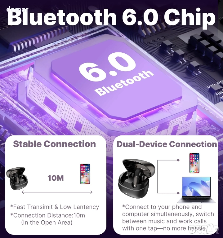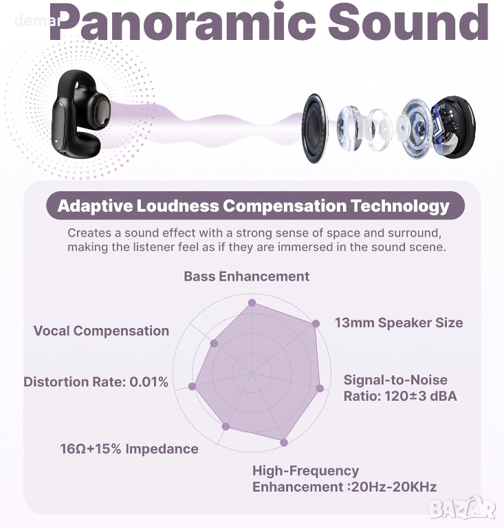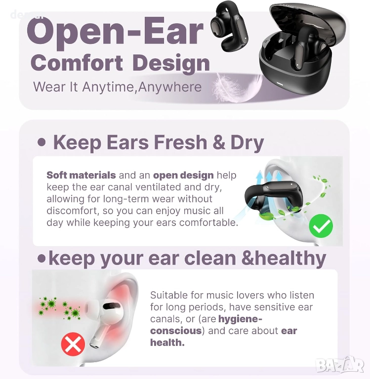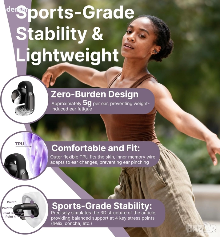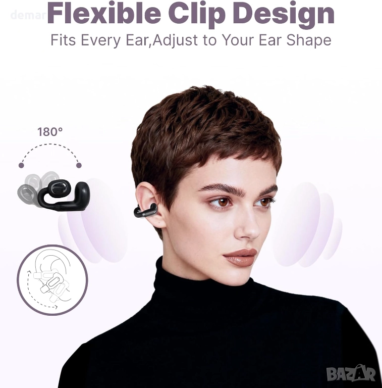 Тези слушалки са с ултра лек C-образен дизайн на щипката за ухо, която приляга здраво, без да влиза в ушния канал, осигурявайки прилягане без натиск, подходящо за целодневно носене и енергични движения. Те предлагат незабавно сдвояване, многоточкова свързаност и стабилна работа с ниска латентност чрез Bluetooth 6.0, заедно с ENC намаляване на шума, което филтрира до 95% от фоновия шум за по-ясни разговори. С водоустойчивост IPX5 за защита от пот и дъжд, плюс батерия, осигуряваща около шест часа непрекъсната употреба, те поддържат надеждно слушане и комуникация по време на тренировки, пътуване и мобилна работа.