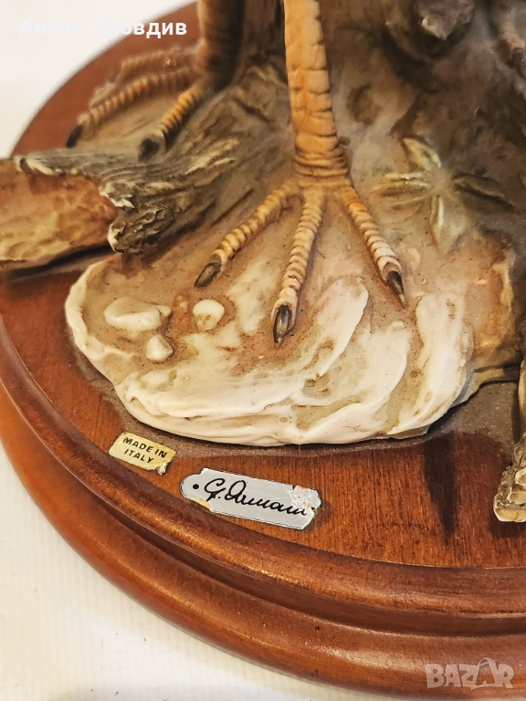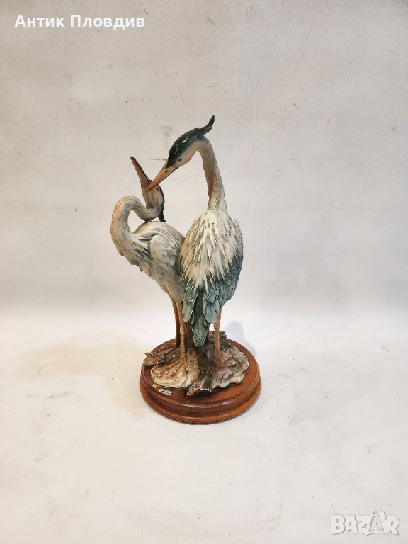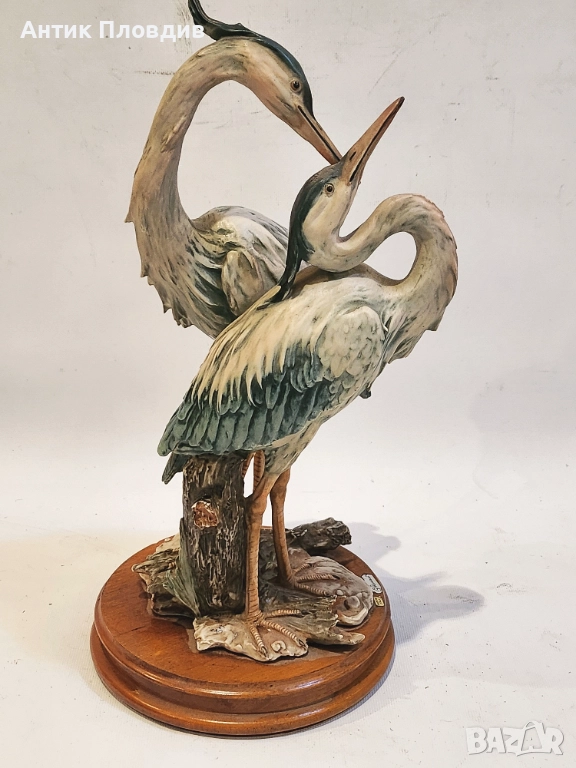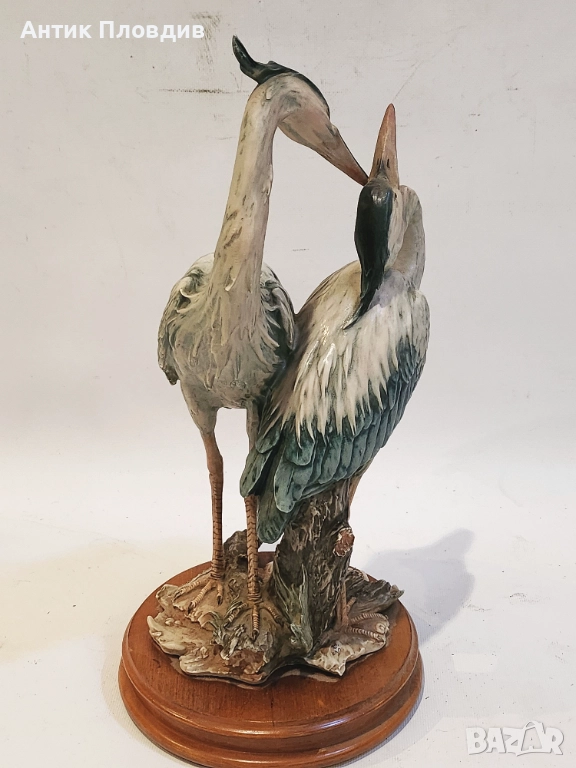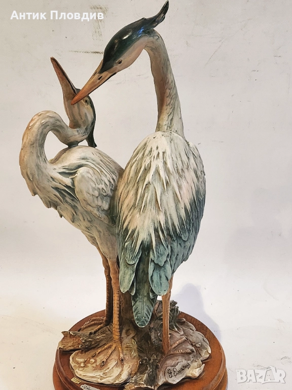 Изящна фигурна композиция на G. Armani, изработена в Италия. Двойка чапли, моделирани с характерната за автора детайлност и естествена пластика. Поставена е върху дървена основа и е в отлично състояние. Подходящ акцент за интериор, който цени художествената работа и природните мотиви.