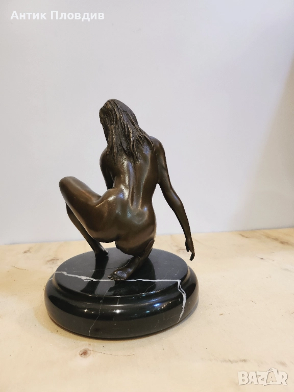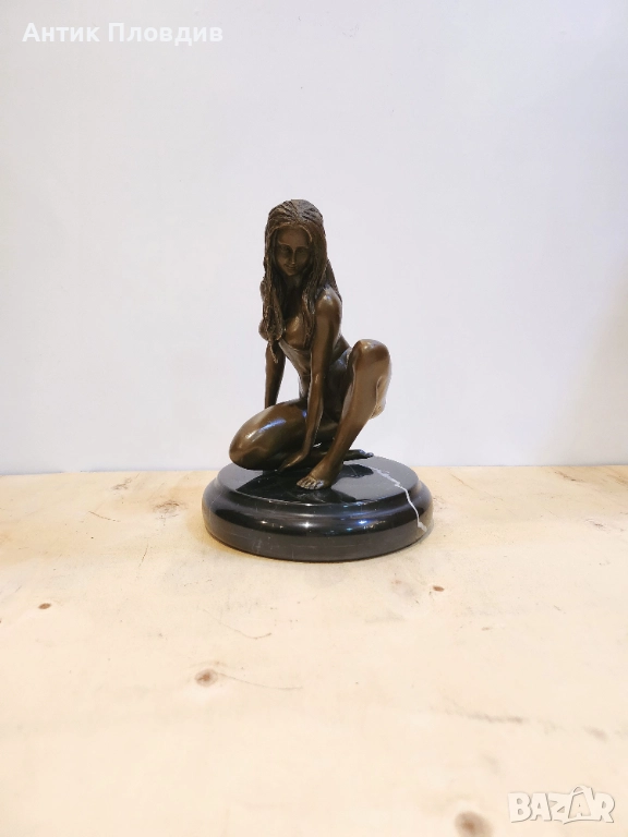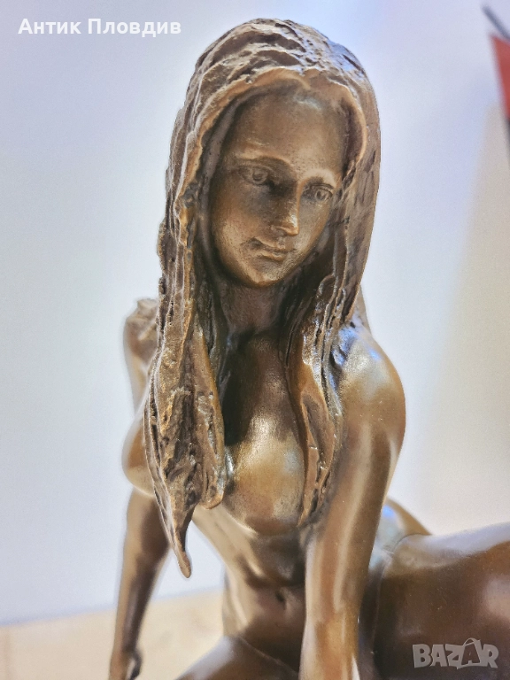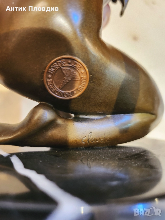 Елегантна бронзова фигура на млада жена, поставена върху кръгла мраморна основа. Статуетката е нова, изпълнена с фин моделаж и красив топъл бронзов тон. Носи релефен медалонBords de Seineи подпис, което я вписва в традицията на съвременните студийни отливки. Подходяща акцентна декорация за дом или офис.