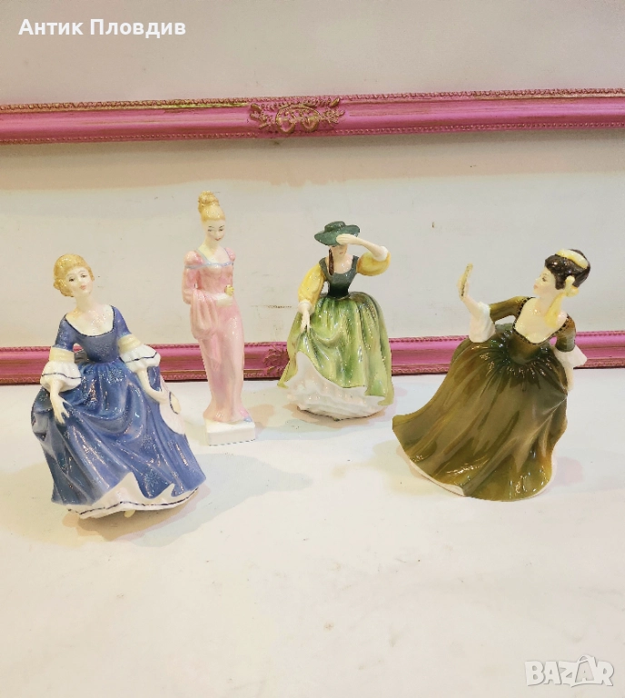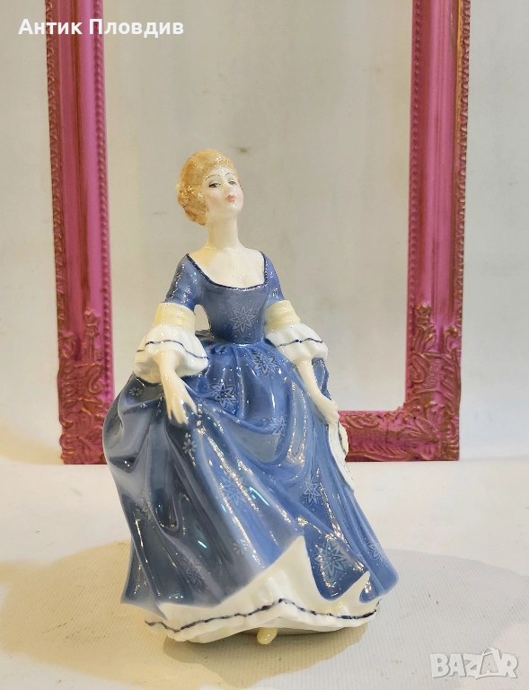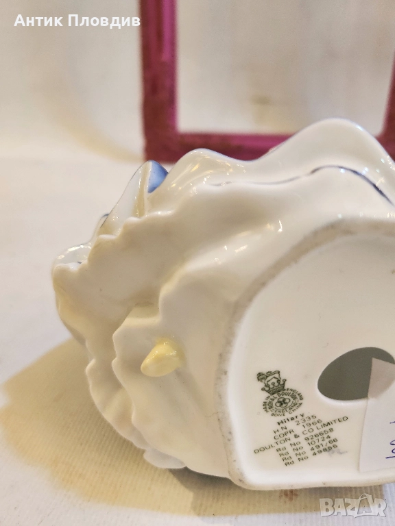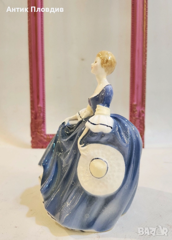 Елегантна порцеланова фигура “Hilary”, произведена от Royal Doulton през 1966 г. (модел HN 2335). Изработена от bone china и отличаваща се с богат ръчен декор в синя палитра и изящен жест на движение. На дъното са нанесени всички фабрични маркировки, каталожният номер и регистрационните дизайни. Прекрасен избор за колекционери и за ценители на английския порцелан. Състоянието е отлично.
