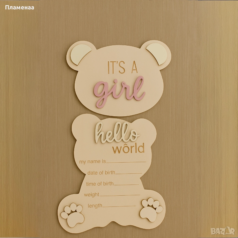 Представяме ви нашите красиви и стилни дървени табелки “It’s a girl” и “It’s a boy” – идеалният начин да обявите появата на вашето малко съкровище! В долната част на табелката има удобно място, където можете да запишете името на бебето, датата и часа на раждане, теглото и ръста. Така табелката се превръща в уникален и личен спомен, който остава завинаги. Идеални за: Фотосесии „Новородено“ Декор в детската стая Подарък за бъдещи родители