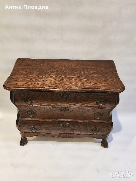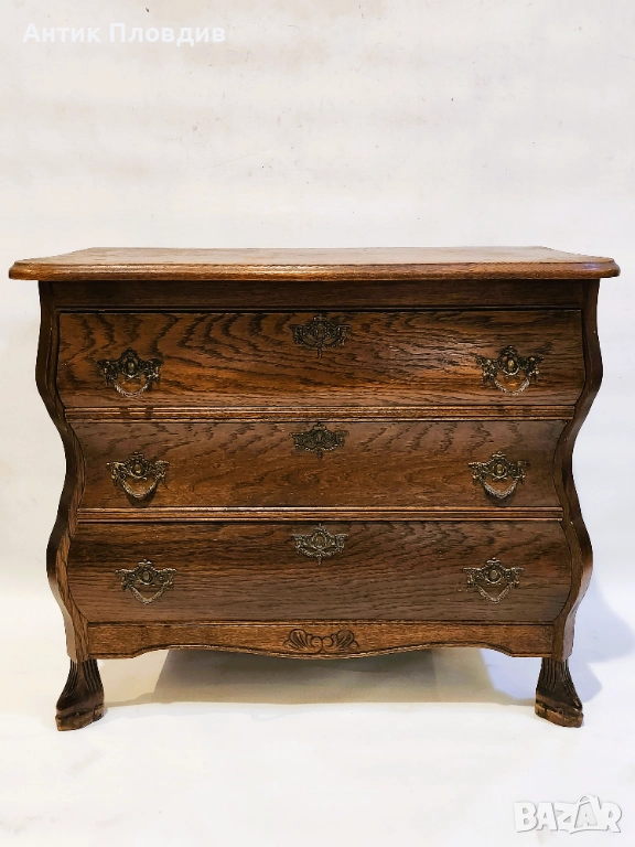 Скрин в традиционна линия с елегантно извити профили и декоративни метални дръжки. Изработен е от комбинация от масивно дърво и шперплат, което осигурява добро съчетание между устойчивост и по-ниско тегло. Разполага с три дълбоки чекмеджета, подходящи за съхранение в спалня или всекидневна. Състоянието е много добро.