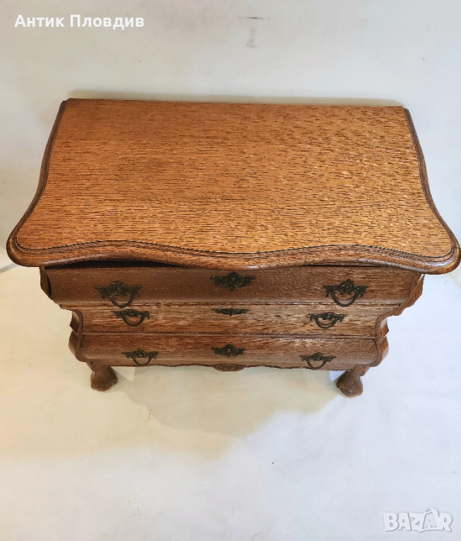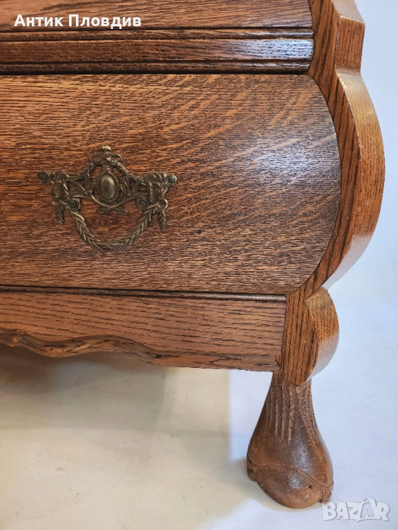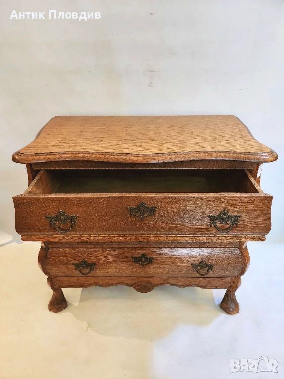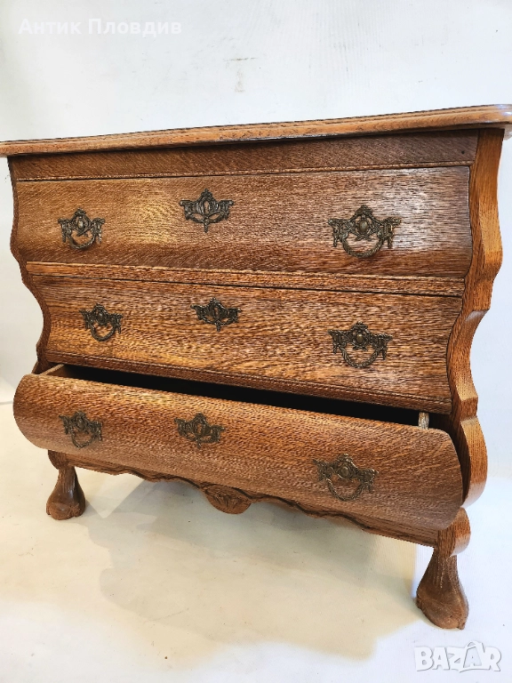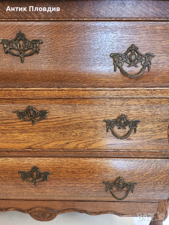 Старинен скрин с барокова линия и изразена извивка на корпуса, изработен от масивен дъб. Формата тип "бомбе" и декоративните бронзови дръжки му придават френски характер и елегантно присъствие. Идеален за интериор с винтидж или класически акценти.