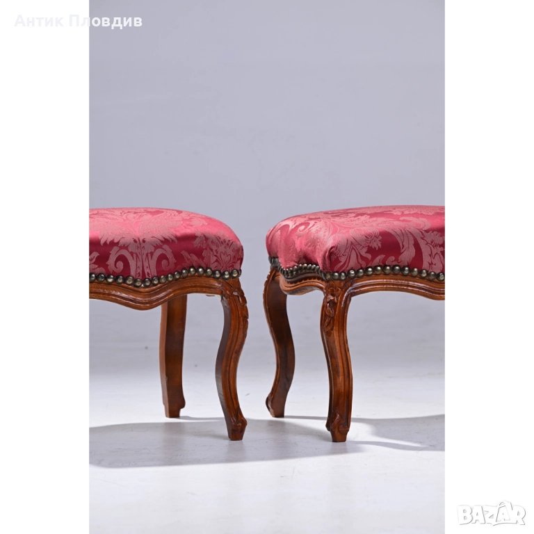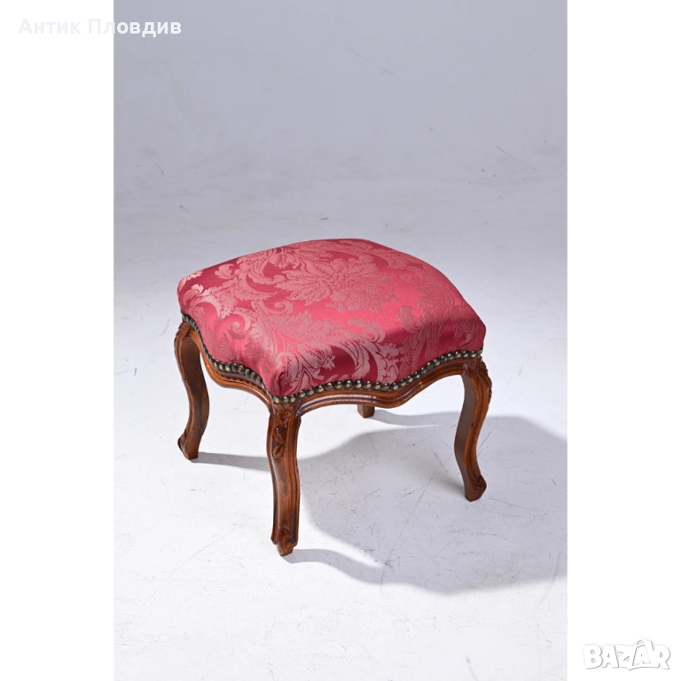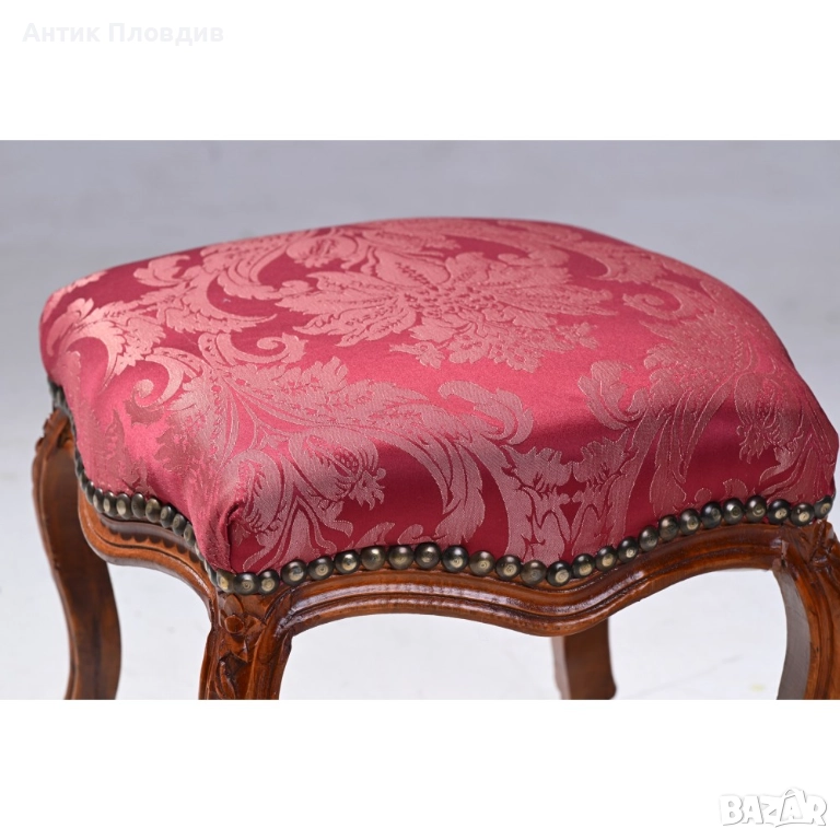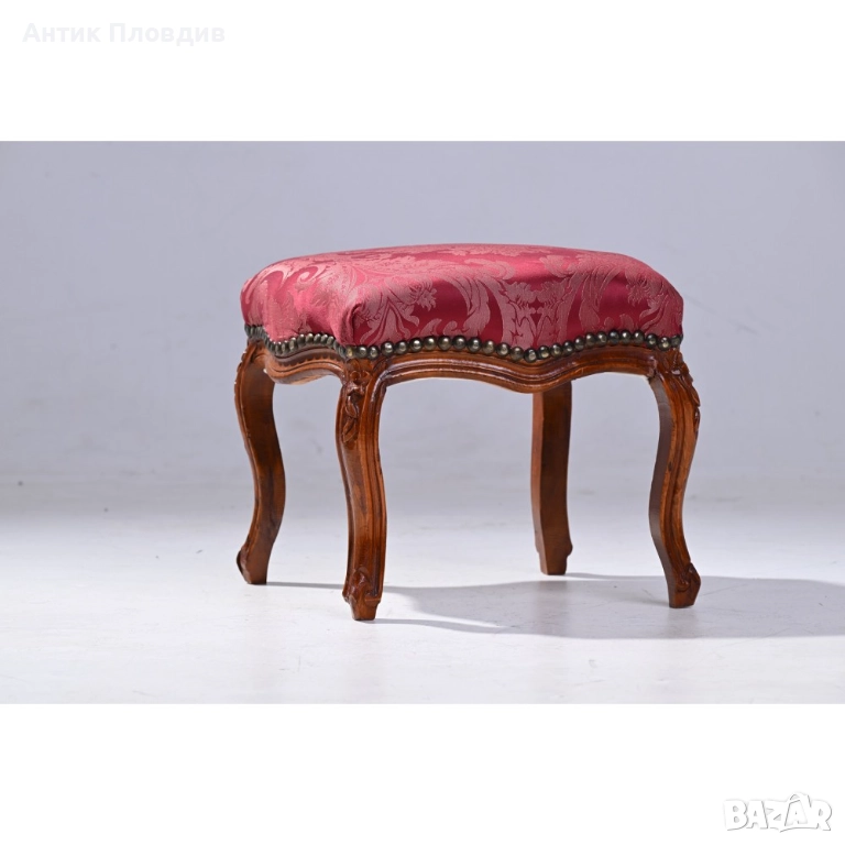 Представяме Ви изискана табуретка в класически стил “Луи 15”, създадена да бъде елегантен и функционален акцент във вашия интериор. Изработена от масивно дърво, табуретката впечатлява с обраната си дърворезба, която придава изтънченост и изисканост. Винено червената сатенирана дамаска с класически десен добавя нотка на лукс и хармония. Тази табуретка е идеалното допълнение към всяка стая, предоставяйки както стил, така и комфорт.