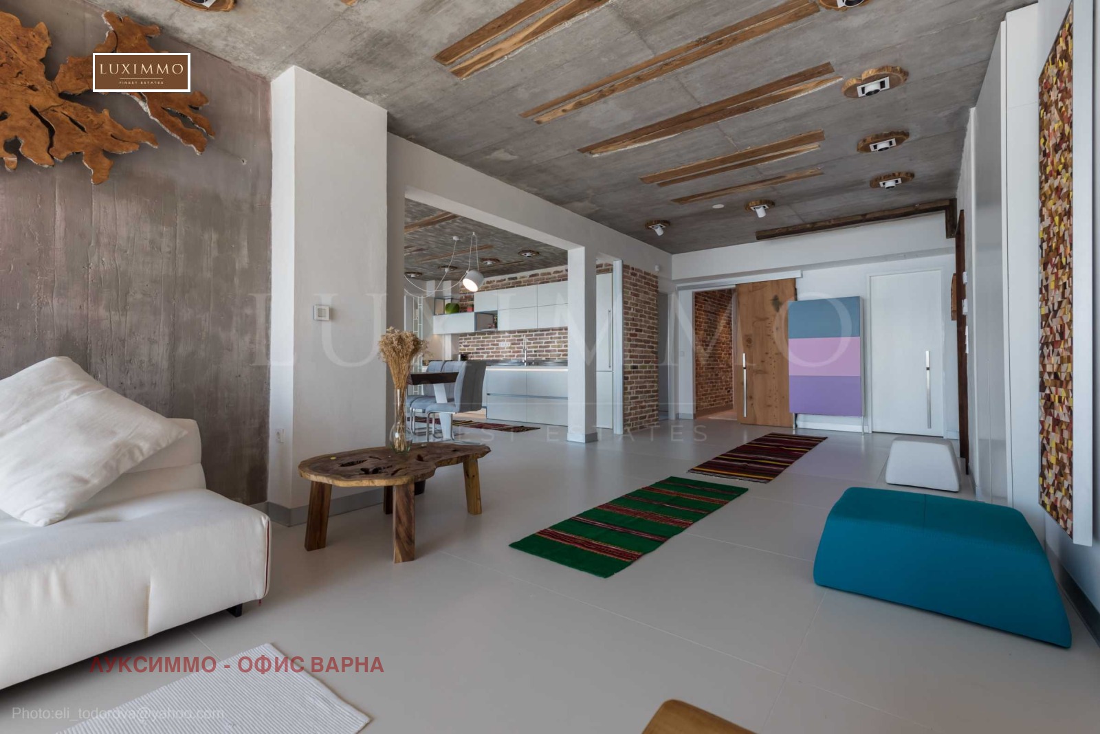 Дизайнът е уникален - естествен и модерен, предизвикателен и светъл, носещ посланието на автономност, релакс и морската атмосфера. В бетоновите плочи по тавана на апартамента са вградени естествени дървени орнаменти от акация. Тухлените стени и бетонът са използвани за естествена декорация, като са допълнително обработени, импрегнирани и грундирани. Мебели, кухня, матраци и дивани, атрактивни плочки, осветителни тела - всички са на известни италиански марки. Вниманието в трапезария е с акцент на екстравагантната маса, изработена по поръчка, от ценно и рядко дърво от Амазонка. Банята е отделена със стъклена врата, за изобилието на слънчева светлина, а всички санитарии са първокласно немско качество.